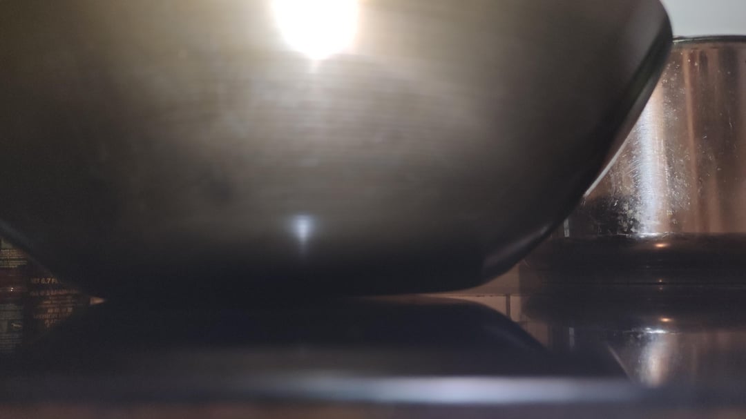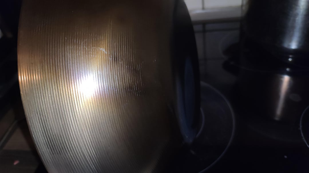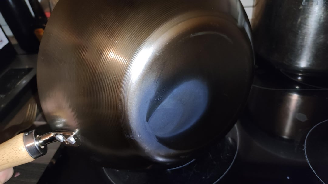 Shit was ist hier beim Einbrennen Bitte schiefgelaufen??? Es hat erst Super funktioniert aber der Wok hat irgendwie ne Wölbung jetzt am Boden und steht nicht mehr gleichmäßig auf dem Boden ;(