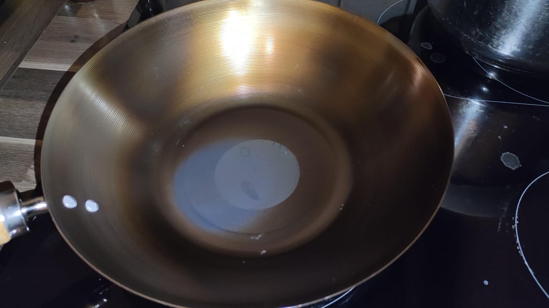 Ich habe es nach Anleitung gemacht erst erhitzt auf höchste Stufe, dabei den Wok gedreht damit die Seiten auch was abbekommen und das wars.
