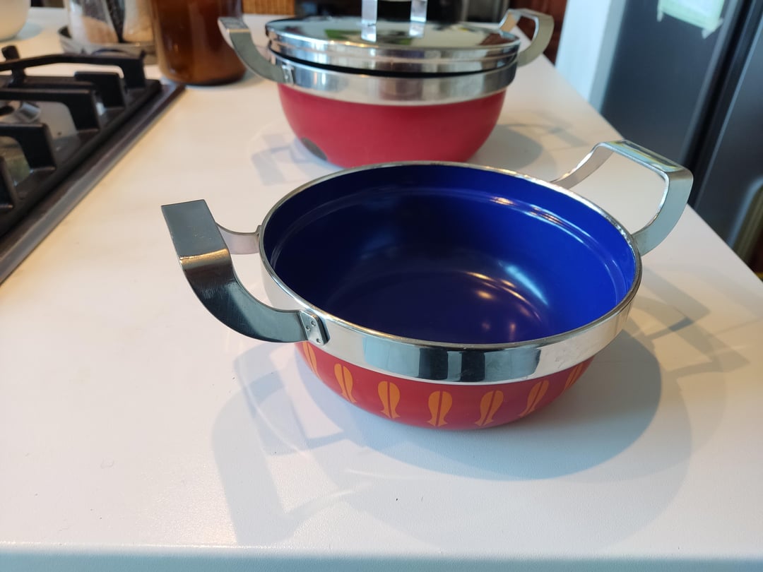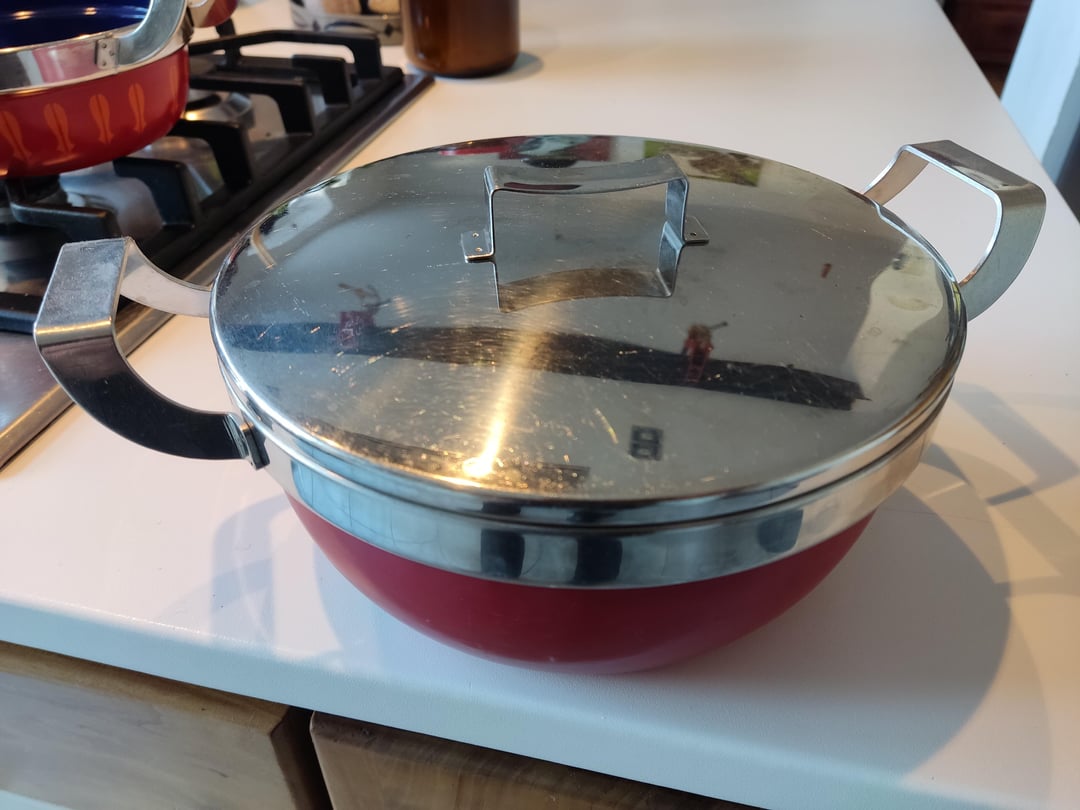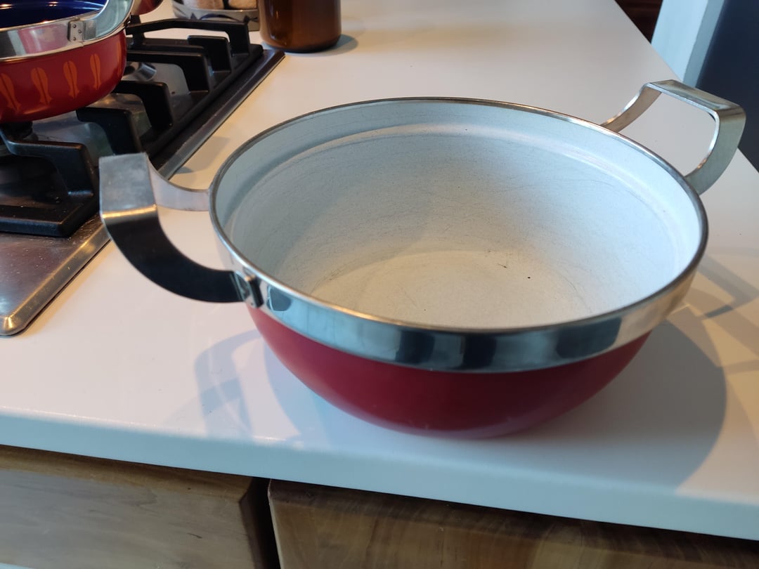 Hi! – ich habe hier eine Serie Töpfe geerbt, farbig emailliert, Deckel Edelstahl, der Boden in Kupfer (der Topf aber magnetisch), verschiedene Größen, die besten Töpfe, die ich je hatte. Der flache ist mir vor einiger Zeit auf den Fliesenboden gefallen, die Emaille ist abgeplatzt, außen bis innen. Ist aber die beste Größe für Saucen etc., daher hätte ich den gern gebraucht nochmal. Ich finde aber nichts im Netz, neu, gebraucht, alte Serien, nichts. Keinen Hinweis keinen Aufdruck, keine alten Rechnungen.