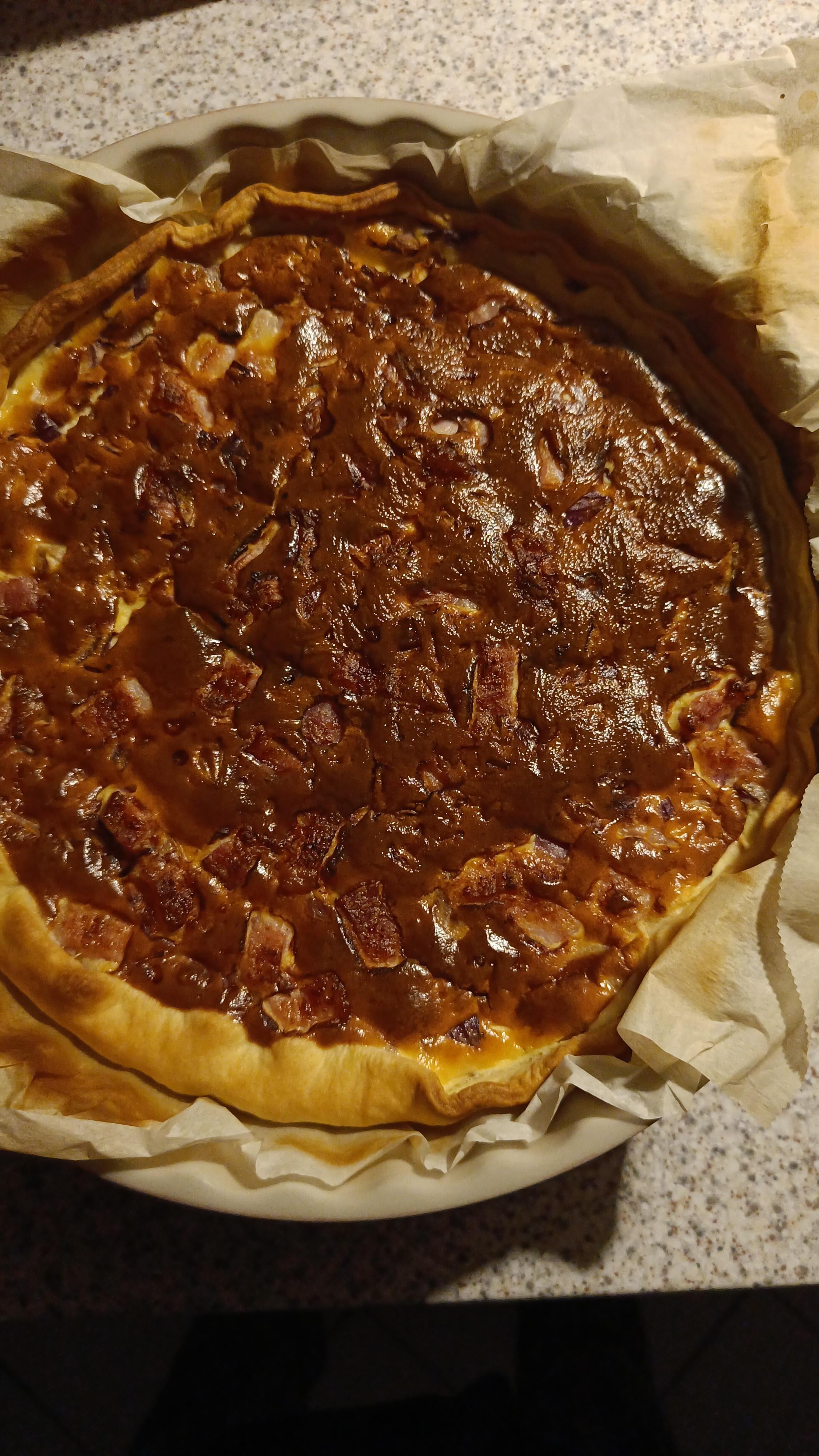 Sie hat 200 g Crème Fraîche, 3 Eier, Bauchspeck und 1/4 Zwiebel, und wurde für 35 min um 180°C gebacken. Der Teig habe ich im Supermarkt gekauft.