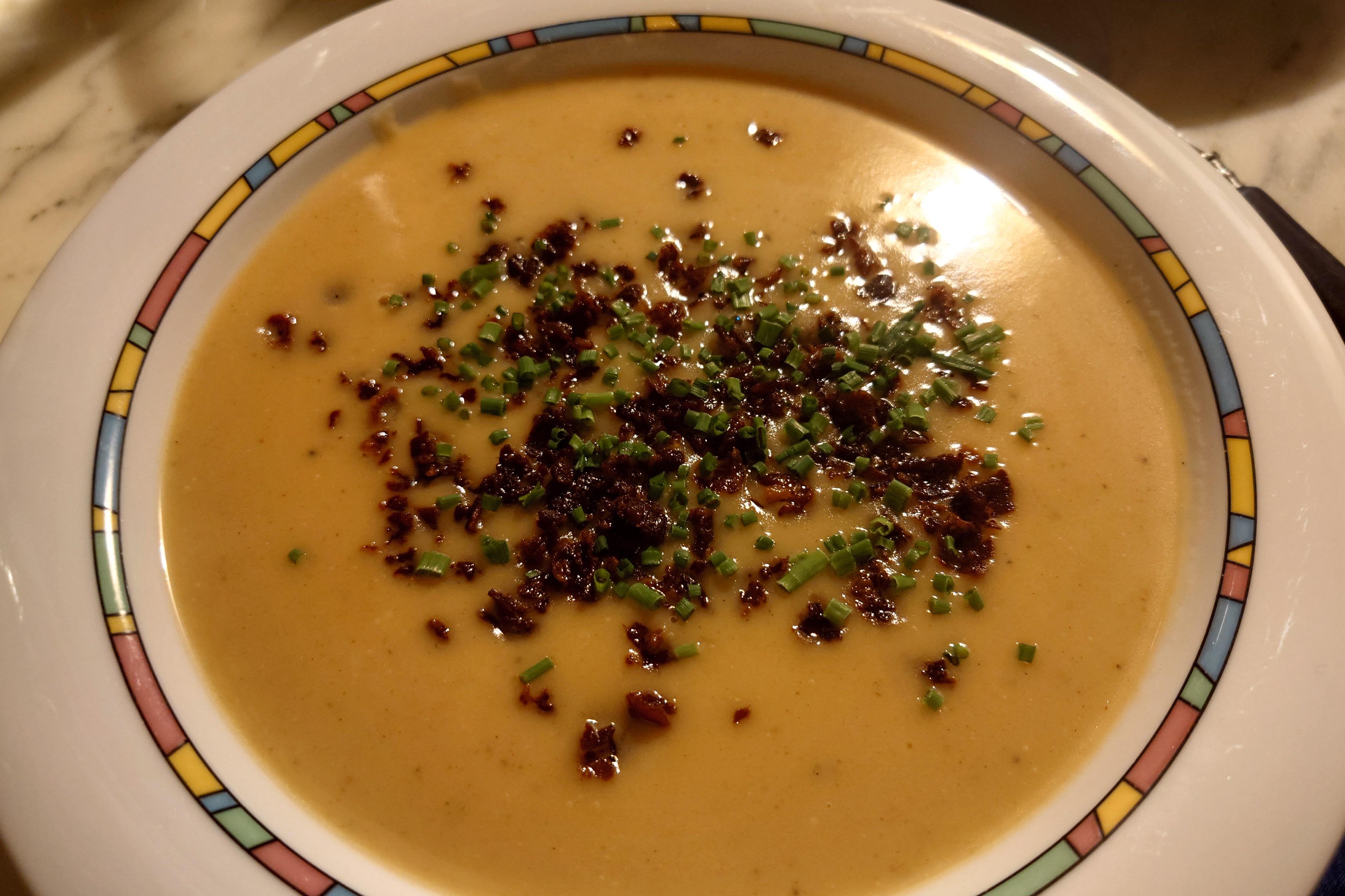 Abschmecken (je nach dem was für Brühe ihr hattet braucht ihr jetzt vielleicht kein Salz mehr) und servieren mit Schnittlauch und Speck, wenn ihr noch Sahne habt könnt ihr die auch halbsteif schlagen und einen Löffel auf die Suppe geben.