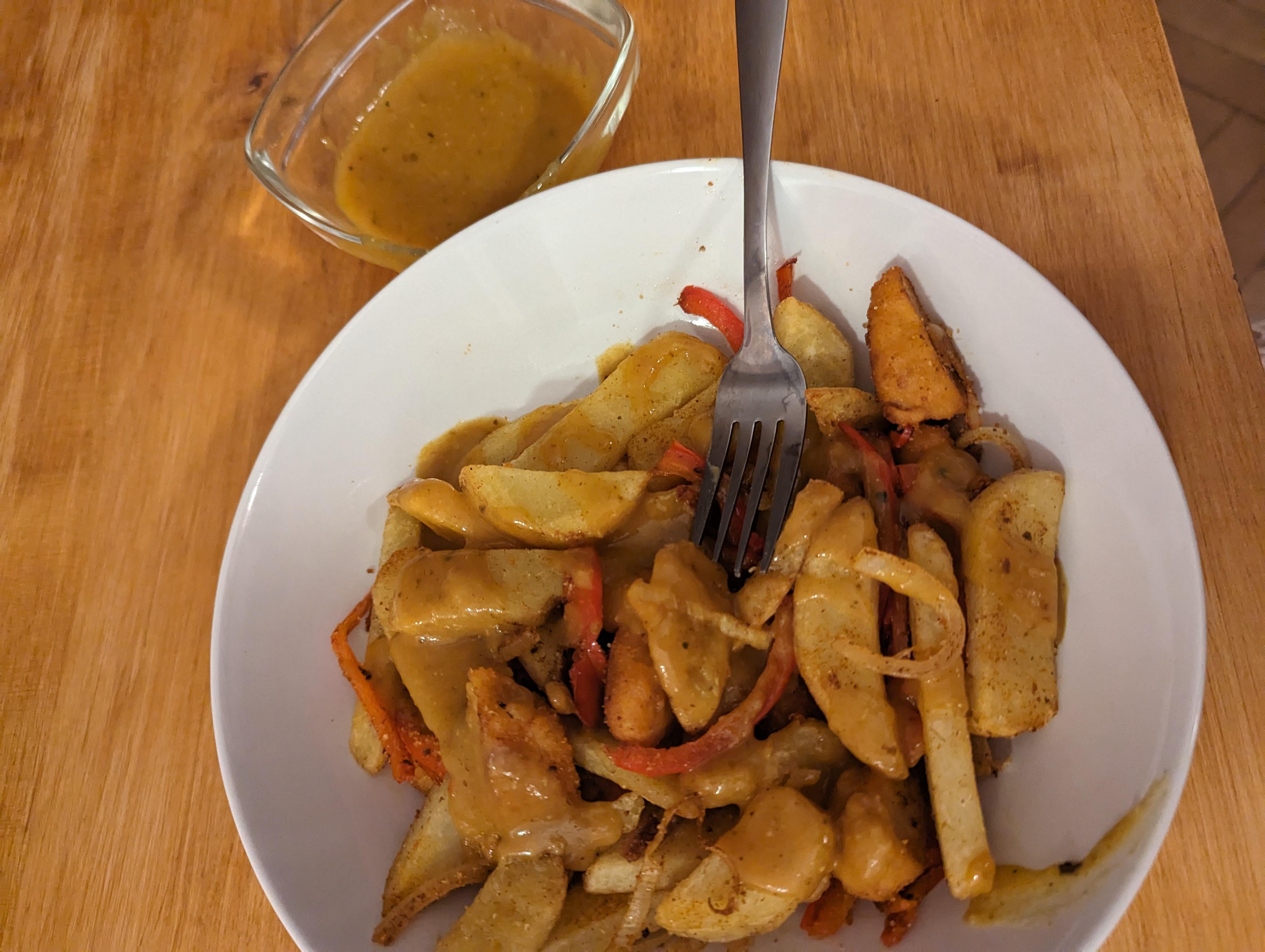 Die Pommes in den Airfryer packen, währendessen Zwiebeln, Paprika und Huhn in der Pfanne anbraten. In der Zeit eine Mehlschwitze in einem Topf ansetzen, diese mit Gemüsefonds auffüllen und die Gewürze in die entstandene Sauce mischen. Wenn die Pommes fertig sind diese zu dem Gemüse in der Pfanne packen, und mit einigen Prisen der Gewürze schön alles durchschwenken. Fertiges Gericht mit der Currysauce servieren.