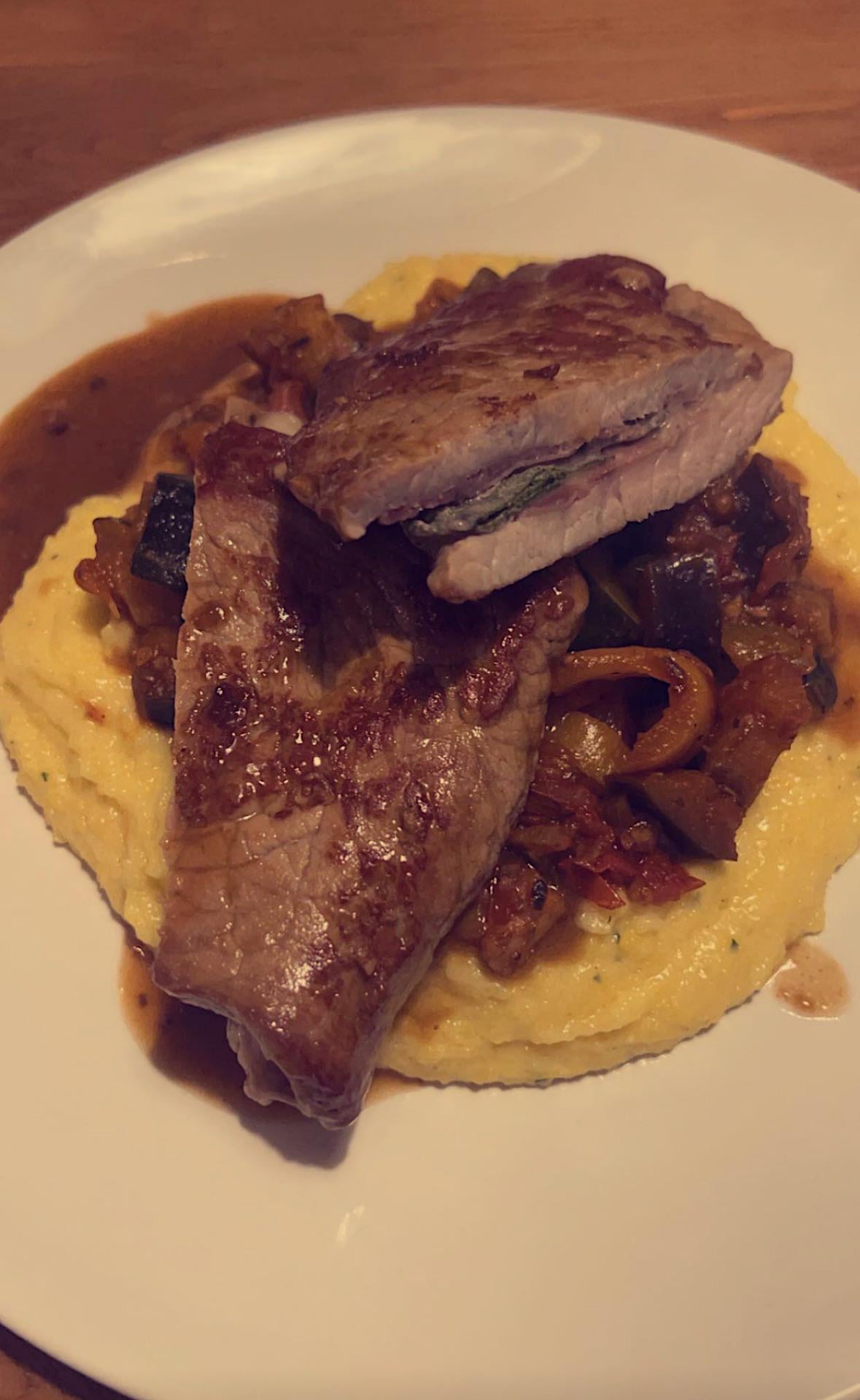 Polenta mit Brühe und Milch eingekocht, gute Flocke Butter dazu.