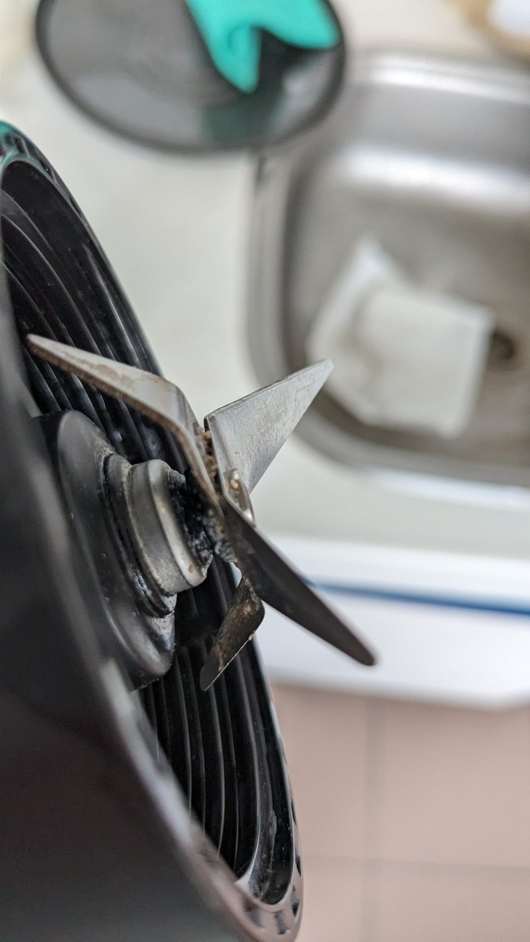 Mit Spülmittel und warmen Wasser einweichen und dann mixen. Wiederholen bis es passt. Und ab sofort nach jedem Einsatz reinigen und nicht nur einmal im Jahr ..
