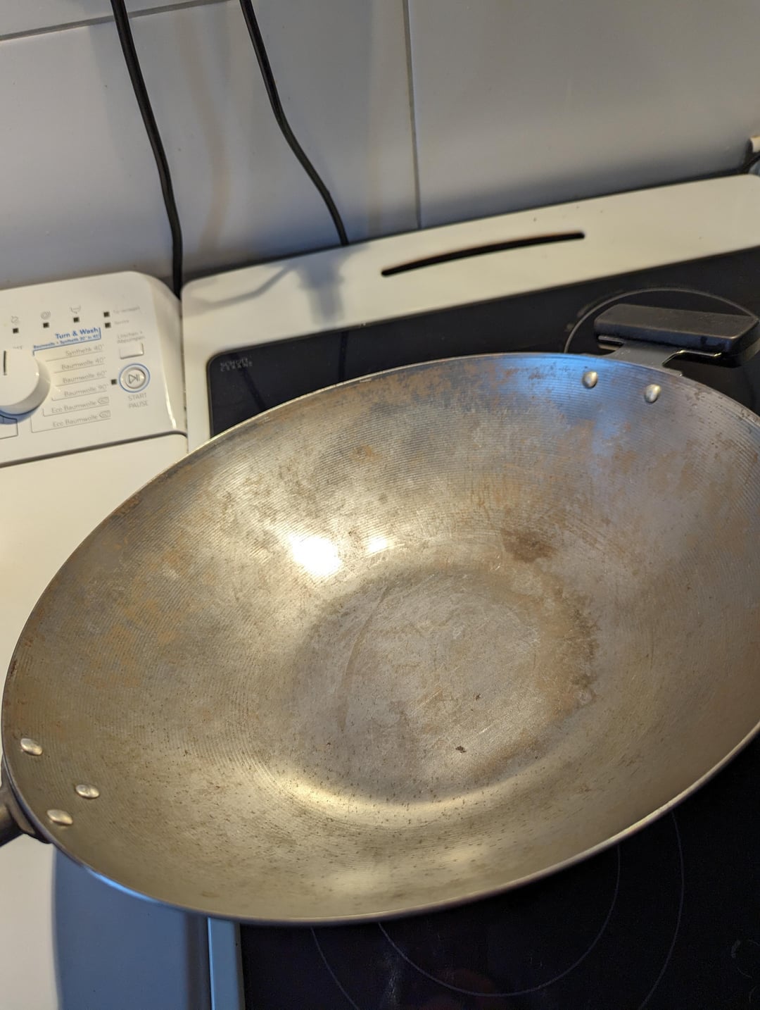Wenn das ein Carbonstahlwoks ist, bleibt der auch höchstens eine halbe Mahlzeitzubereitung lang blank.