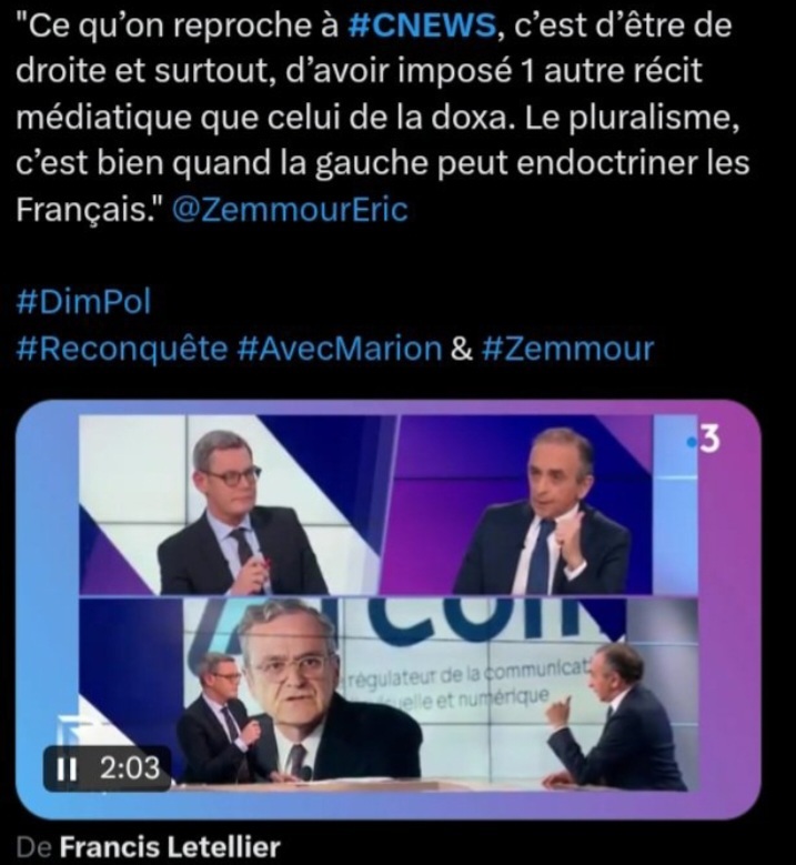 Zemmour, en tant qu’ex-chroniqueur vedette de CNews (donc en connaissant bien les mécanismes et la finalité de cette chaîne, où il y était mis en avant), lâche accidentellement sur France 3 que CNews est une chaîne d’opinion orientée sur une ligne éditoriale précise (et proche de son mouvement politique) et également que la finalité première de cette chaîne ce n’est pas l’information mais de lutter contre ce que l’extrême droite appelle “la doxa”