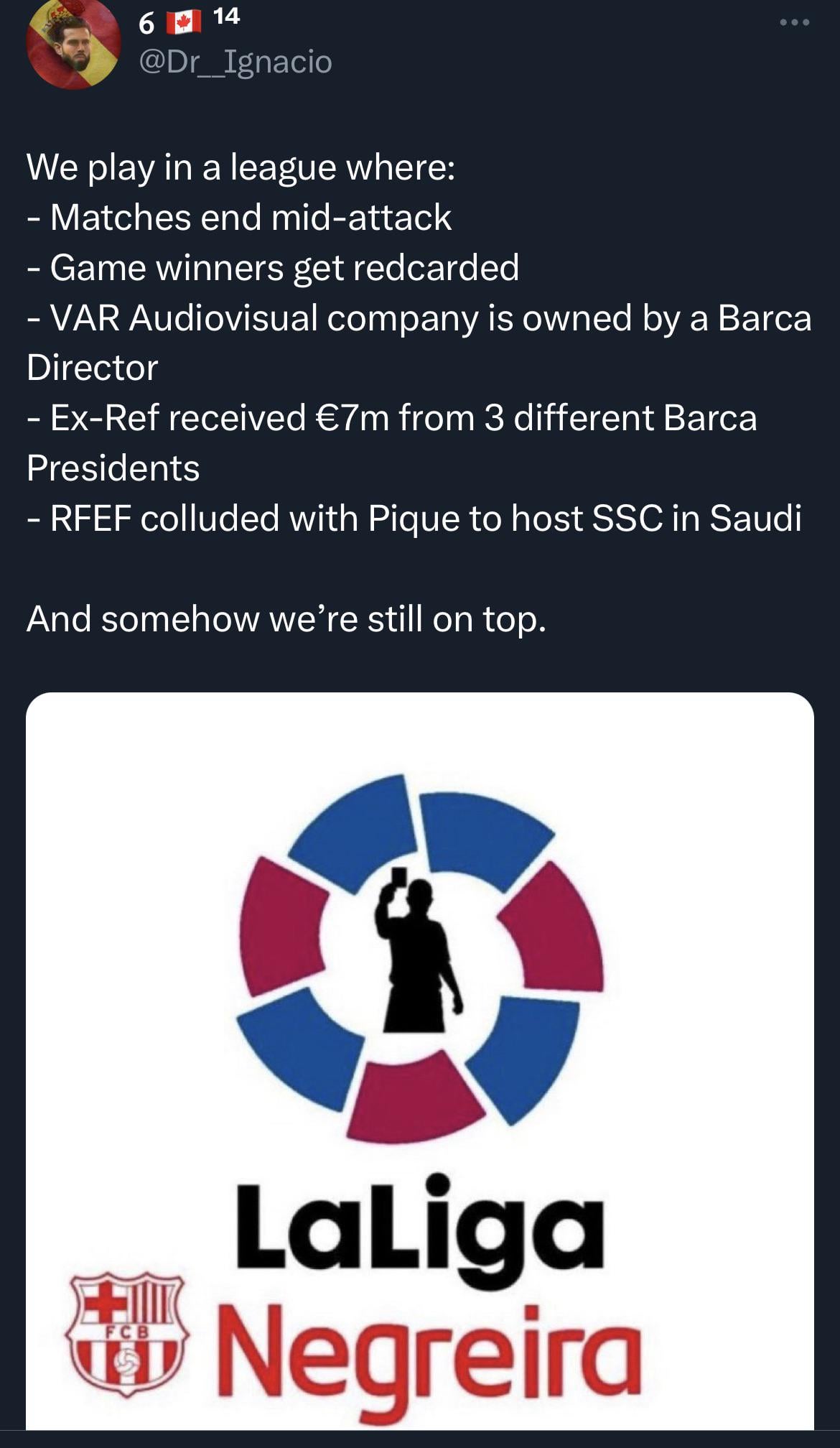 somehow yall made it about fucking Barça, absolutely pathetic. Shit call by the referee, and that’s the end of it. EDIT: Your downvotes make me hard, keep em coming 🤯