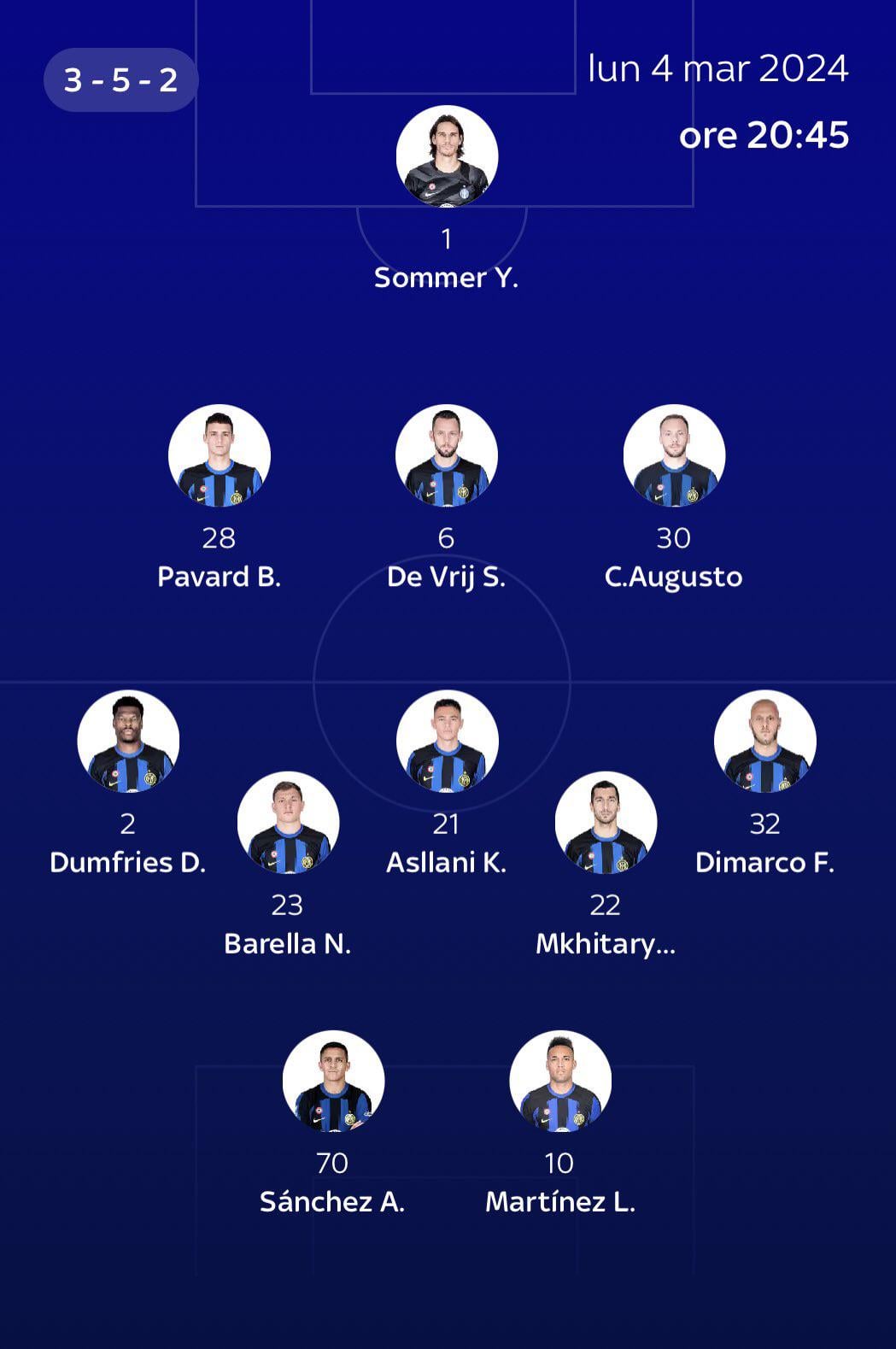 [Sky Sport] Inter predicted lineup to face Genoa: Sommer; Pavard, De Vrij, Augusto; Dumfries, Barella, Asllani, Mkhitaryan, Dimarco; Sanchez, Lautaro.
