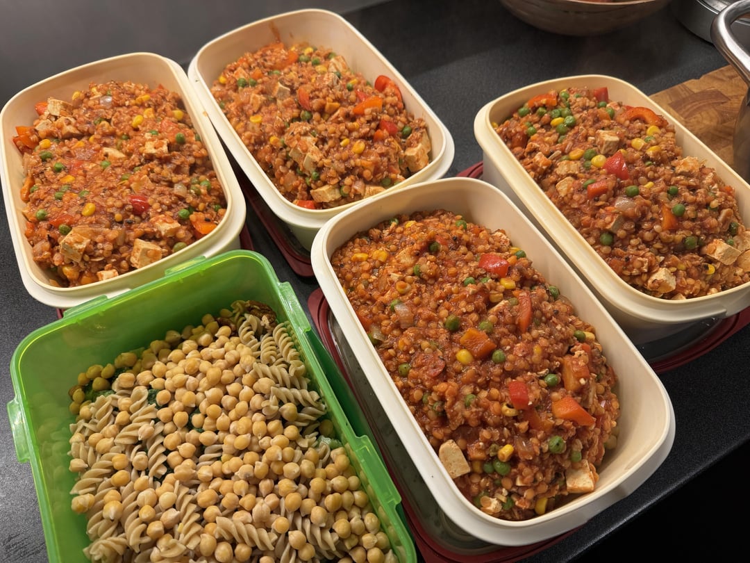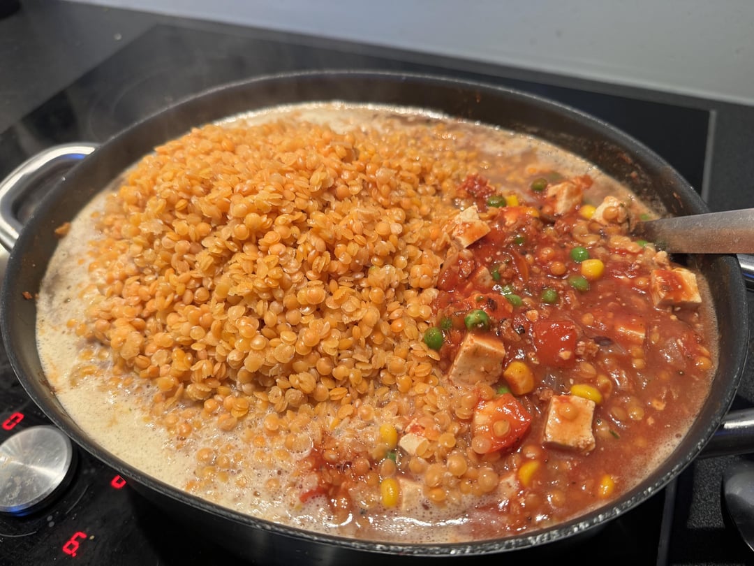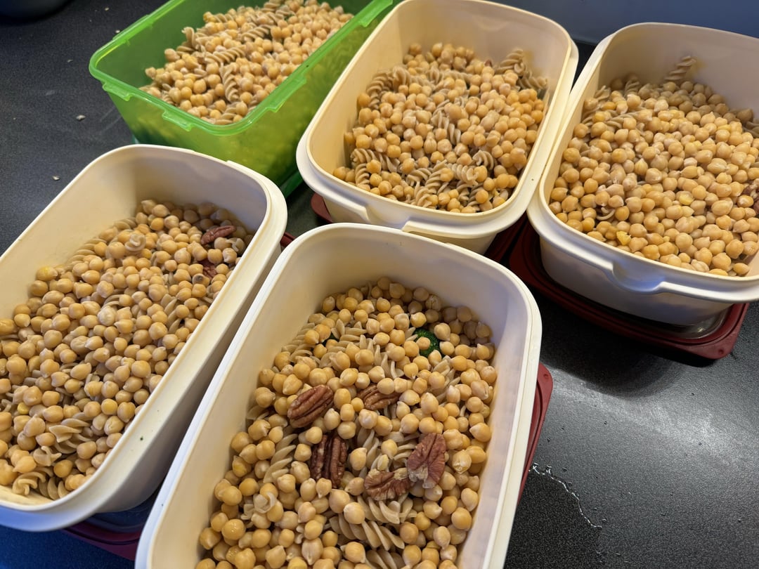 Eine Woche gibt es Kichererbsen, eine Woche Kidneybohnen. Und Nudeln wechseln sich mit Reis oder Kartoffeln ab. Der Rest ist aber immer gleich. Gewürzt wird der Rotz hauptsächlich mit Cayenne Pfeffer und dem was das Gewürzregal so hergibt. Je nach Lust und Laune, mal mediterran, mal morgenländisch, mal fernöstlich.