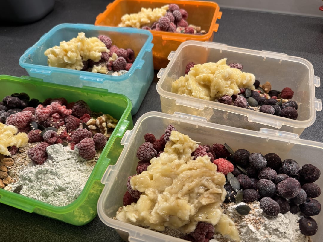 Die Menge an Haferflocken habe ich immer weiter gesteigert, die Himbeeren kamen neulich dazu, ebenso der Ingwer, Grünkohl habe ich letztes Jahr durch Spinat ersetzt. Sonst ist das aber gleich geblieben.