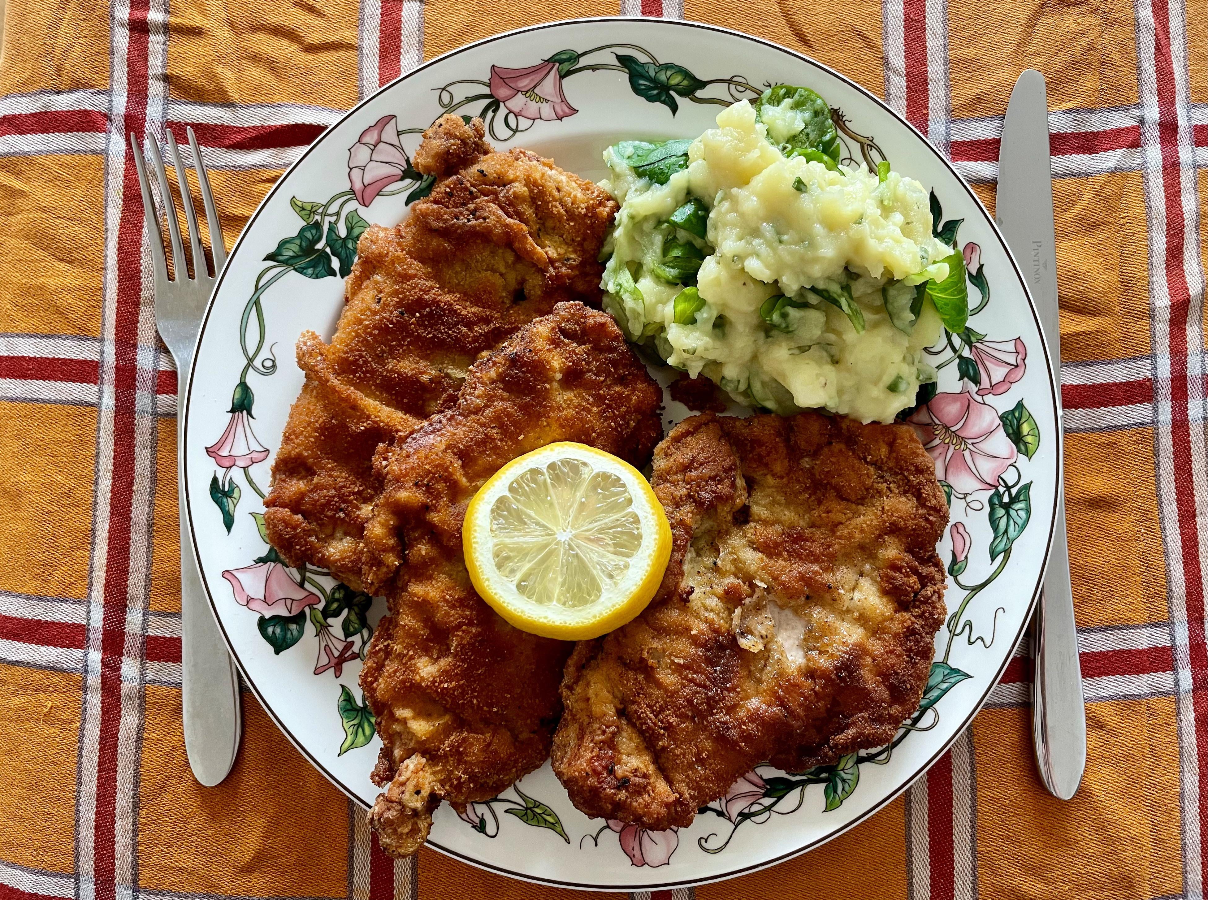Die Schnitzel mit einer Pfanne plattklopfen und von beiden Seiten salzen und pfeffern. Auf je einem Teller Mehl, mit Sahne verquirlte Eier und Paniermehl verteilen. Die Schnitzel erst im Mehl wälzen, dann in der Eimasse, dann im Paniermehl – dabei das Fleisch nicht fest auf Letzteres drücken, sondern locker panieren. Dann kommen die Schnitzel in eine Pfanne mit ca. 170 Grad heißem Butterschmalz. Die Pfanne in Bewegung halten, damit das Fett auch über die Oberseite des Schnitzels schwappt. Wenn die Unterseite goldbraun ist, wenden und fertig garen.