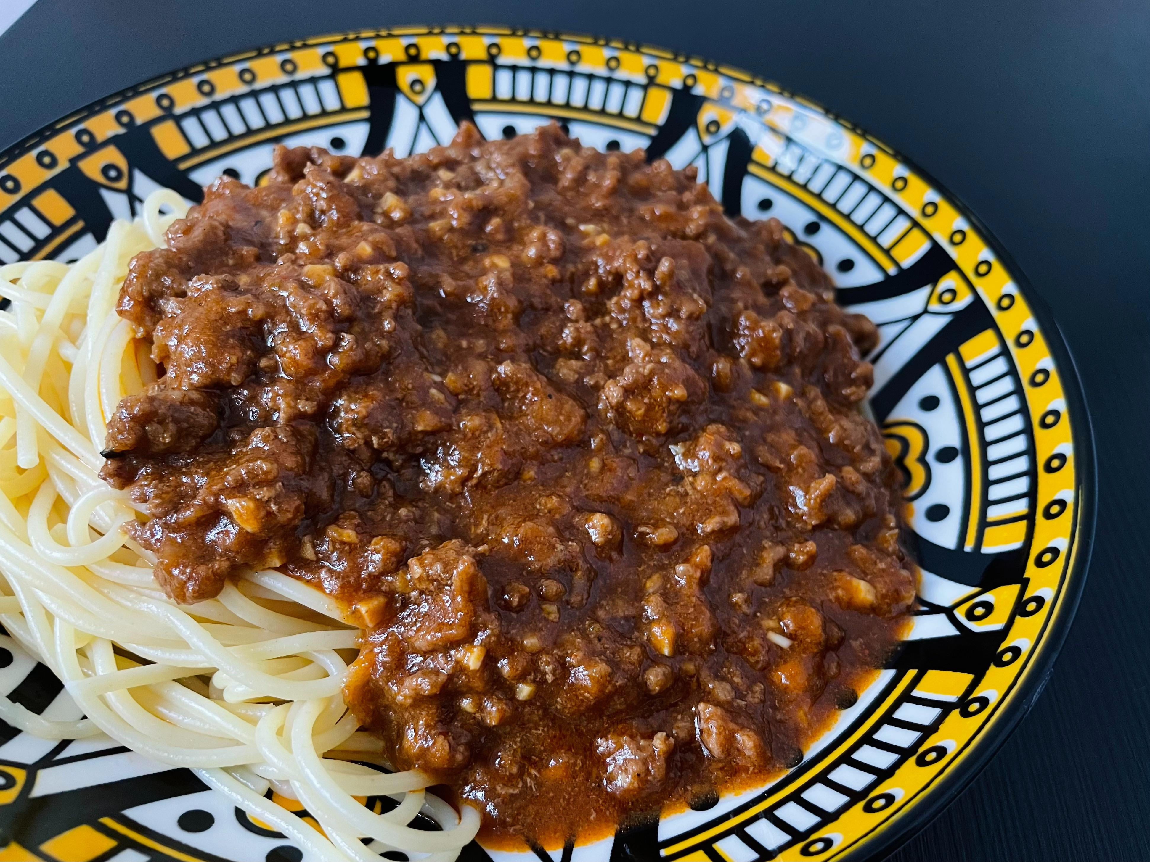 – das Tomatenmark habe ich zum gebräunten Hackfleisch gegeben und angeröstet. Dann kamen die Gewürze dazu, die ich kurz mitgebraten habe, bevor ich das Zwiebelpüree und das Wasser hinzugefügt habe.