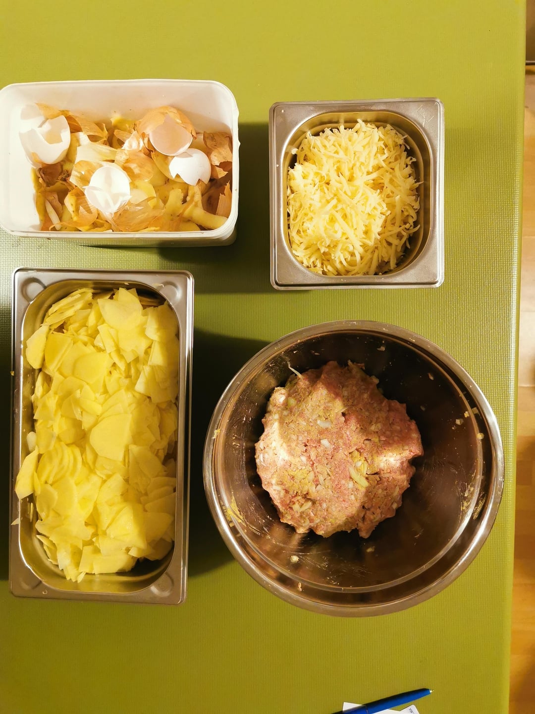 -Kartoffeln(2000 g) schälen und in feine Scheiben schneiden (Reibe/Küchenmaschine)