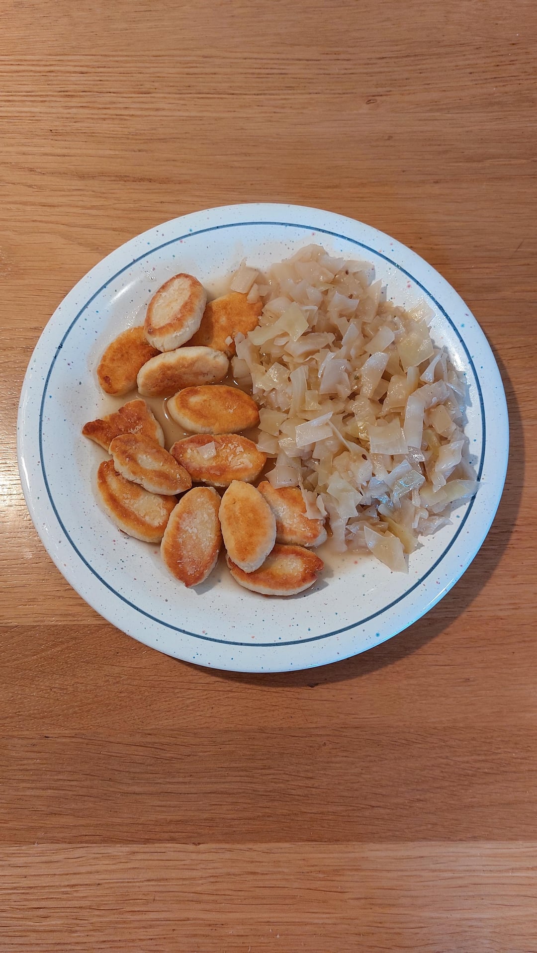 Topfennudeln aus Quark und Mehl im Verhältnis 2:1, salzen. Verkneten, zu Rollen formen, Stücke abschneiden, etwas flach drücken. In Mehl wenden. Bis zu gewünschten Bräune in Butterschmalz ausbacken. Ich liebe dieses Gericht meiner Kindheit.