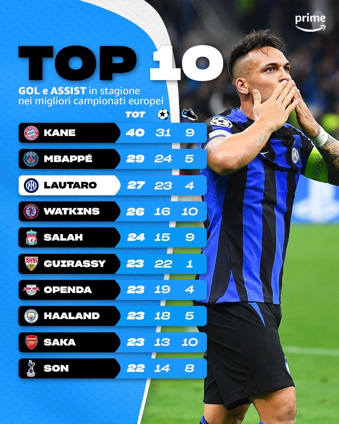 [Amazon Prime Video Sport IT] Players with the most goals and assists in Europe’s top 5 leagues. Lautaro is third, only behind Kane and Mbappe.