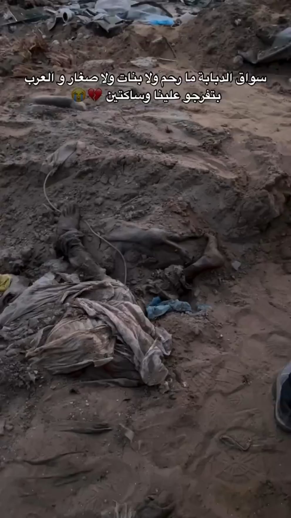 [NSFL] Pour cacher l’étendue du massacre de Al Shifa et rendre non-identifiable les victimes, l’armée Israëlienne a brûlé des familles entières, les ont enterré et passé au bulldozer. Ici on y voit des morceaux de cadavres d’enfants, des mains ligotées, dans les décombres