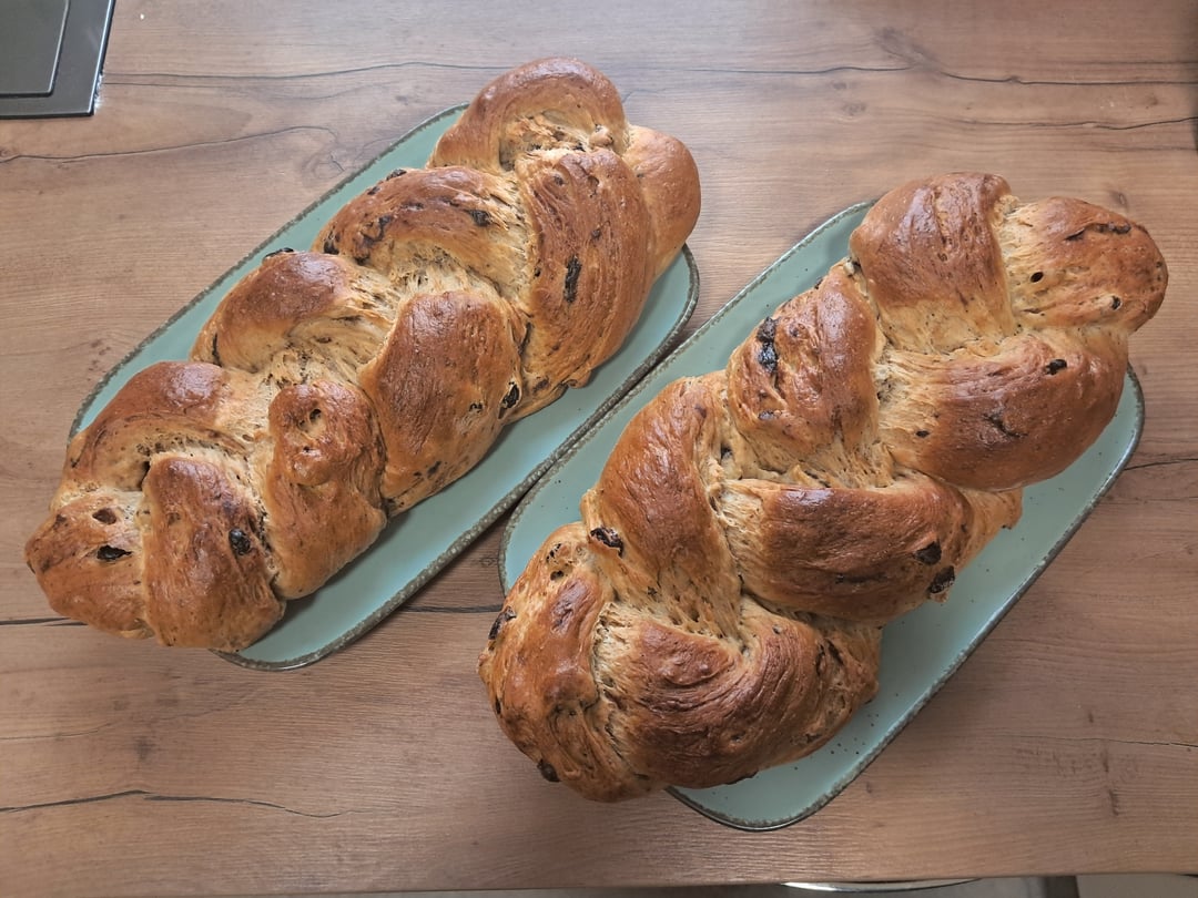 Aus je drei Strängen einen Zopf flechten, auf ein Blech mit leicht mit Mehl bestäubten Backpapier setzen und mit einem feuchten Geschirrtuch abdecken. So etwa eine halbe Stunde gehen lassen. Währenddessen Ofen auf 170°C Ober-/Unterhitze vorheizen lassen.