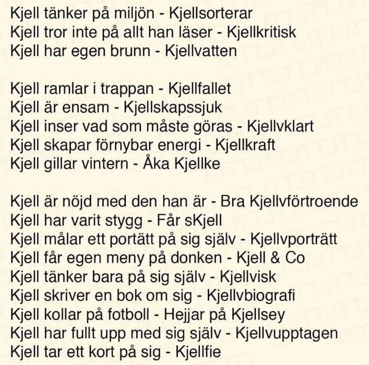 Hur många minns Kjell? Tags:sweden 24 comments Kjell❤️ Så otroligt bra serie! Ser hela minst en gång per år. Mera Kjell. Edit: Tack för att du sprider budskapet. Nu är fredagen räddad för många. Jag älskar att han måste be någon köpa ut Bullens Pilsnerkorv åt honom. Edit: Och varför livesänder han en *pådd kaaast*?? på med hockeytränarpolon å gå underkåååååååver! Fan hur har man kunnat missa det här?! Benny jag kör som nöden kräver vi har snipers i ryggen! Minns så ända in saltpastilens havsorkan. Kom det inte en ny säsong ganska nyligen? Glöm aldrig Kjell från Ullared som gör allt för att behaga sin snygga fru Ros-Marie! Så är det! Måste synka!!! Ta på haka, ta på näsa, ta på mun och NU SITTER DU!! VMA: De har en turné inplanerad i år https://kulturbloggen.com/?p=148658 SvennusSexus Väldigt bra serie! [Kjellfallet](https://1.bp.blogspot.com/-tDhHBbcIzSc/XiqRwPI9Y_I/AAAAAAAALNE/DicCQdA0QgMYjHb36fUiewPqZDwrjH5MwCLcBGAsYHQ/s1600/kjell-si.JPG) minns man honom. RIP uttern utanför Matdax SNAJPERS! Steffe!! Nae… de va inte steffe Fan vill du då jävla mupp? Styltbralla! Trångkaka! Fan man kommer på alla bra ord när folk har gått. Här ligger fyra av mina fjärrkontroller! Jag har snipers i ryggen, kör som lagen kräver! Staffan oh Bengt, … och Petri. Petri han går till DVDn! De här är ju tranan men jag skulle till ekorren, aja fågel som fågel afaan! Man kanske borde skaffa hästsvabb som Anders borg har, de e ju snyggt. Sådär liksom Nope, aldrog hört talas om programmet:) Operation Klotty är inte så illa heller Brukar se den lite då och då…. kan rekomendera Klotty på svt om du vill uppleva Kjell-känslan igen. Minns? Detta är en del av vardagen. Nu SITTER DU Men… Jag är ju på ett Sslääp Om det inte gick mellan tidigt 80-tal och tidigt 90-tal så kommer jag inte ihåg det om det är ett barnprogram. Leave a ReplyYou must be logged in to post a comment.