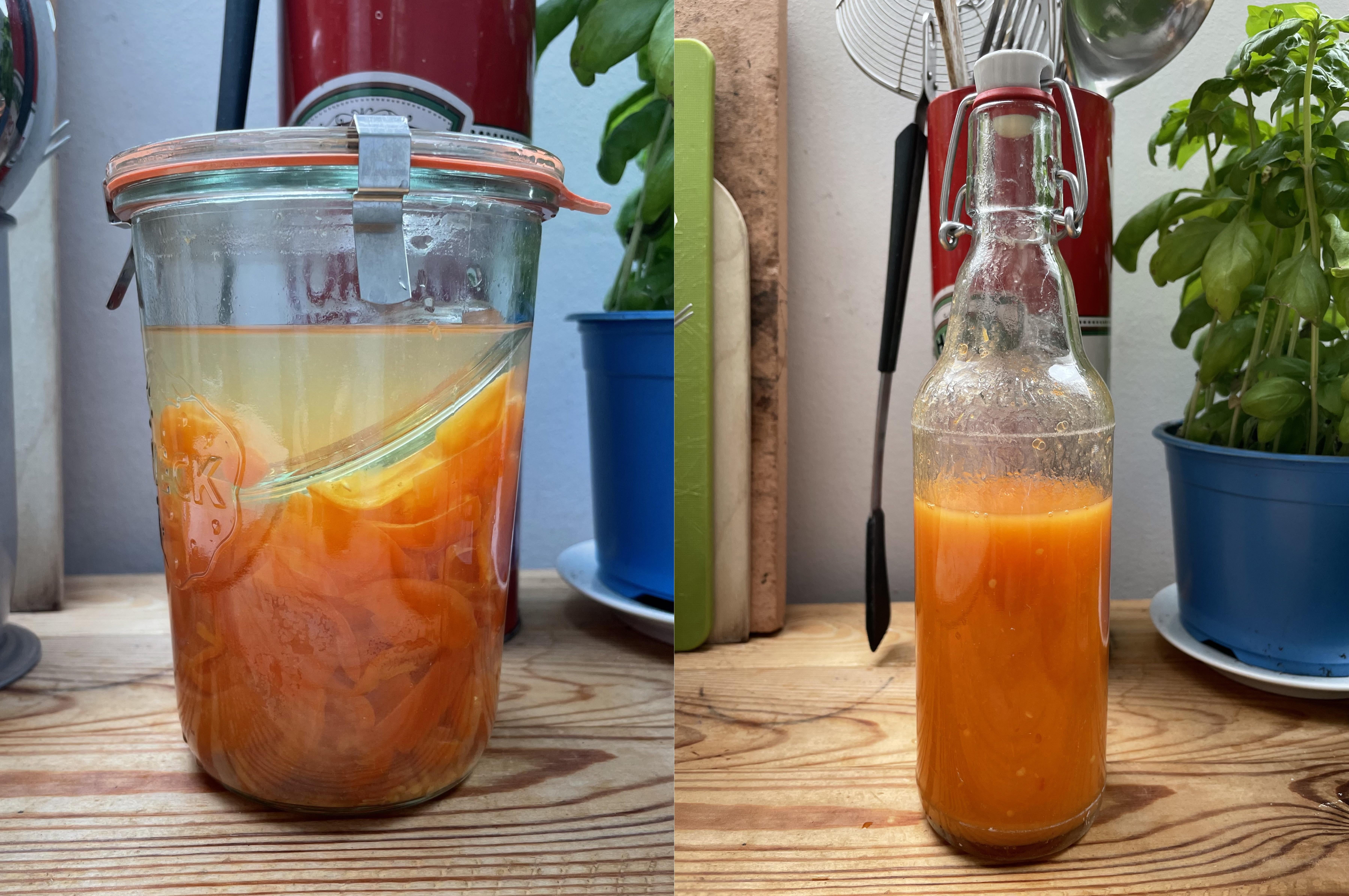 Zu Beginn pürierte ich die festen Zutaten mit 270 ml Weißweinessig und verdünnte die Mischung, bis sie einigermaßen essbar war ☠️ Die Lake ist schön „funky“ und salzig, weswegen ein Schluck davon mit reindurfte. Am Ende wurden es um die 500 ml Hot Sauce 🔥