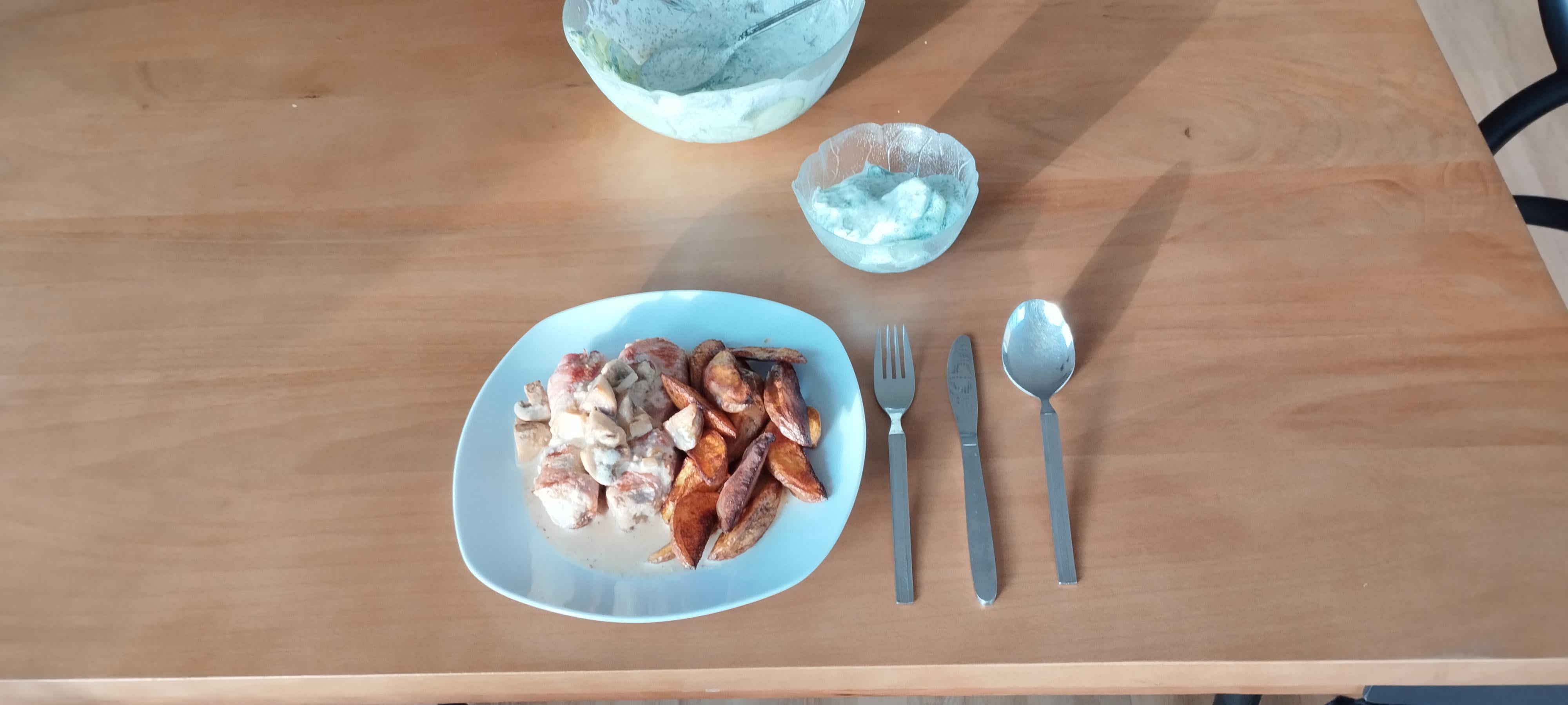 Schweinefilet im Speckmantel in Champignon-Rahmsauce mit selbstgemachten Kartoffelecken und Gurkensalat.