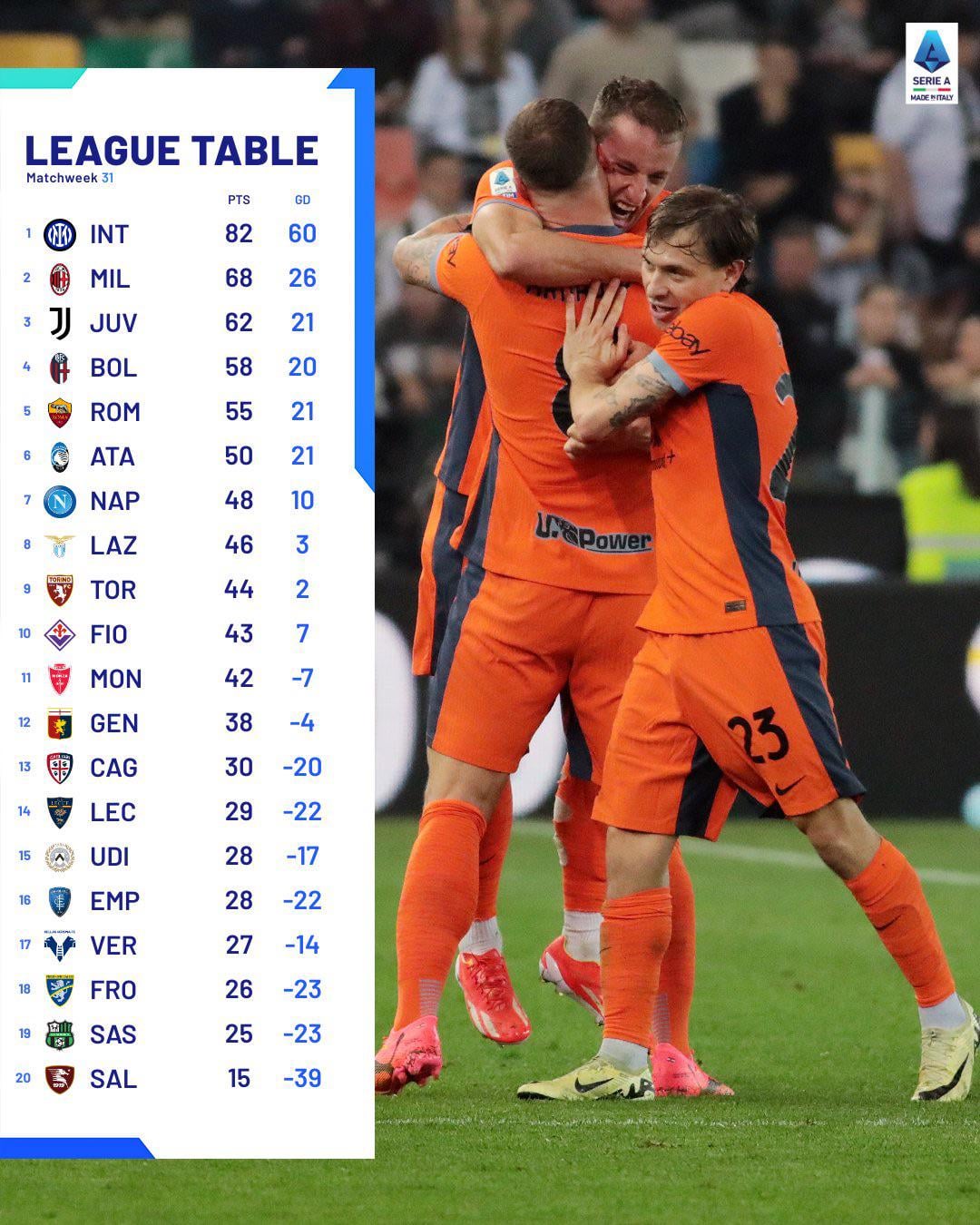 [Official] Serie A standings after Matchweek 31. Inter are +14 on Milan and are 2 wins away from the Scudetto.