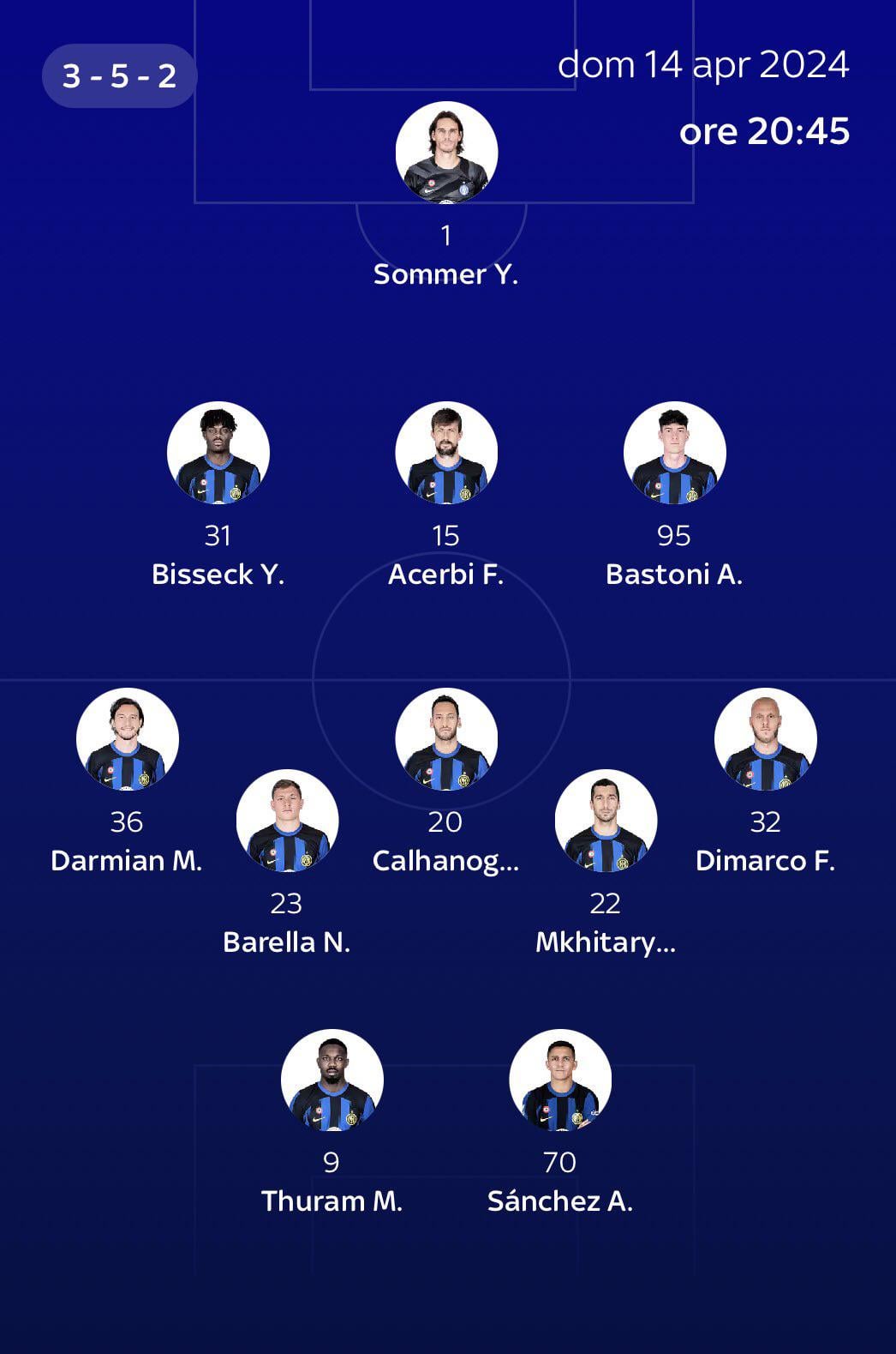 [Sky Sport] Probable lineup for Inter vs. Cagliari: Sommer; Bisseck, Acerbi, Bastoni; Darmian, Barella, Calhanoglu, Mkhitaryan, Dimarco; Sanchez, Thuram.