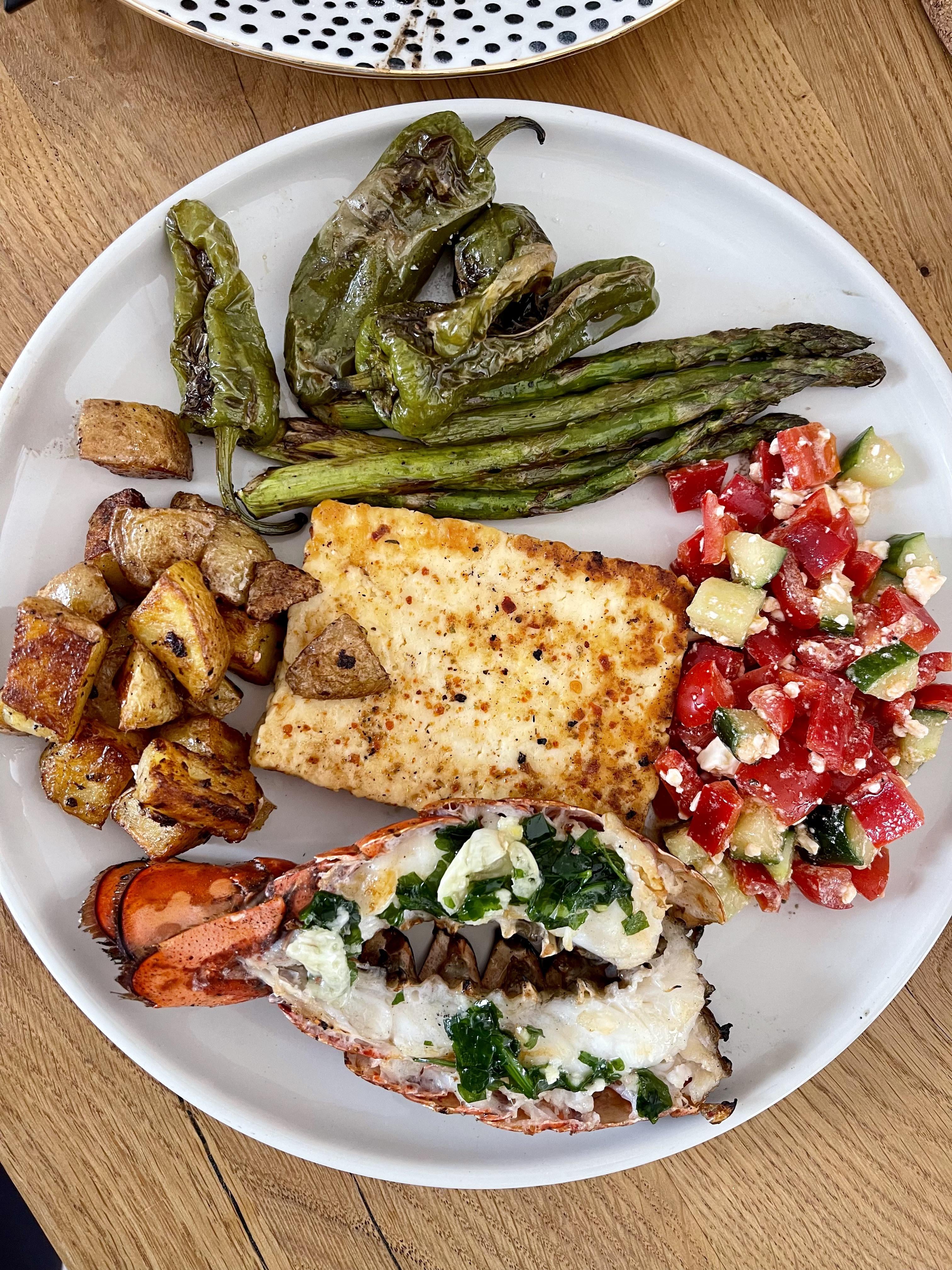 Hummerschwänze, Pimientos, Grillkäse, grüner Spargel, Kartoffeln & griechischer Salat