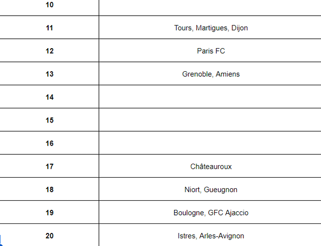 Tu aurais la source? J’aimerais voir la suite du classement et si des clubs n’ont jamais fait mieux que 20e de L1. Curiosité morbide je présume.