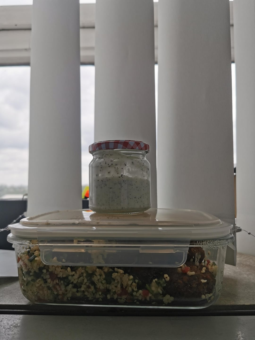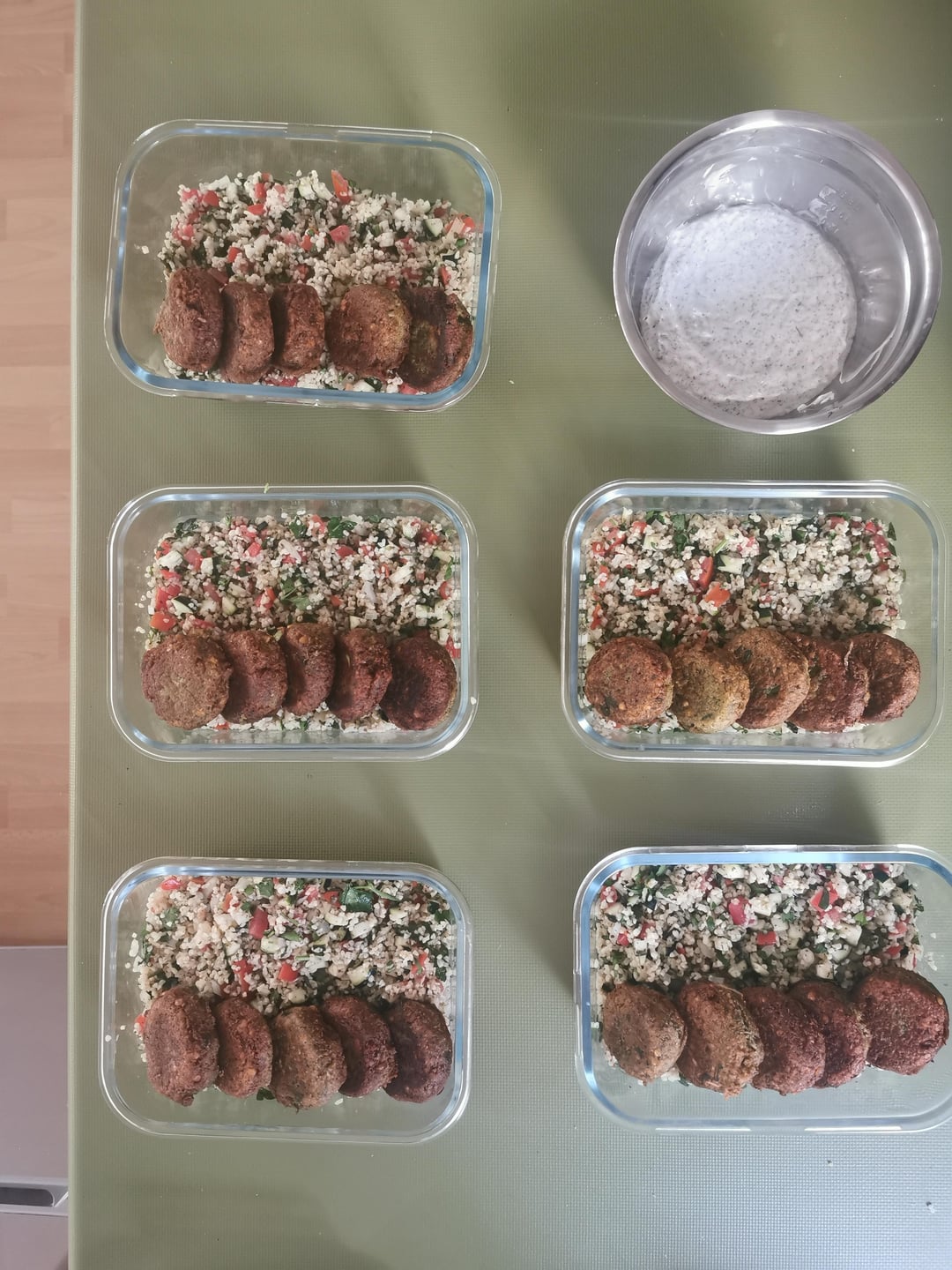 Mealprep KW 16 (Linsenbällchen+Tabouleh+Joghurtsauce) by A_Students_Meal_Prep Tags:Essen machenKochen 2 comments Moin, Die Linsenbällchen waren frisch eine der besten Sachen die ich jemals gekocht habe, kalt dann leider nurnoch lecker und nichtmehr extrem lecker und crispy. Mir ist bewusst das Tabouleh eigentlich mit Gurke ist aber mit Zucchini hält sich besser. Schönes Wochenende [Instagram](https://www.instagram.com/p/C58LGLxNvvw/?utm_source=ig_web_copy_link&igsh=MzRlODBiNWFlZA==) -Linsen(500 g) einweichen (>30 min) -Hälfte der Zwiebeln(311 g) und des Knoblauchs(66 g) fein hacken, andere Hälfte grob zerkleinern -Feine Zwiebeln und Knoblauch mit Bulgur(500 g) mischen und mit kochender Brühe(1 L) übergießen und ziehen lassen -Koriander(1 Bund) und Stiele der Petersilie(1 Bund) grob hacken -Zucchini(412 g) und Tomaten(964 g) entkernen und klein würfeln -Koriander, grobe Zwiebeln und Knoblauch, Linsen, Petersilienstiele und Koriander fein mixen (S+P, Cumin, MSG) -Masse mit Mehl(~50 g) binden, bis sie formbar ist -Zucchini, Tomaten, gequollenen Bulgur und Petersilienblätter vermischen (S+P, Minze, Sumak, (Oliven)Öl, Zitronensaft) -Linsenmasse in Bällchen formen und frittieren -Joghurt(250 g) mit (Oliven)Öl, Zitronensaft, Salz, Minze und Sumak vermischen- Das sieht extrem lecker aus Leave a ReplyYou must be logged in to post a comment.