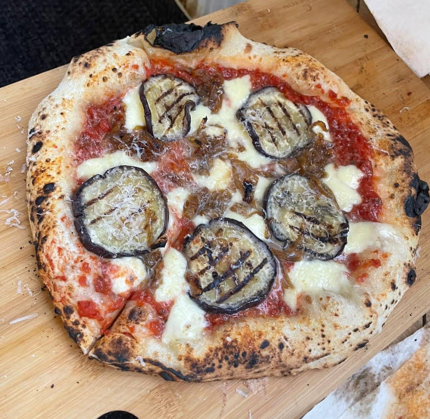 Teig mit 67% Hydration, San Marzano Tomaten, Fior Di Latte, gegrillte Aubergine und karamellisierte Zwiebeln
