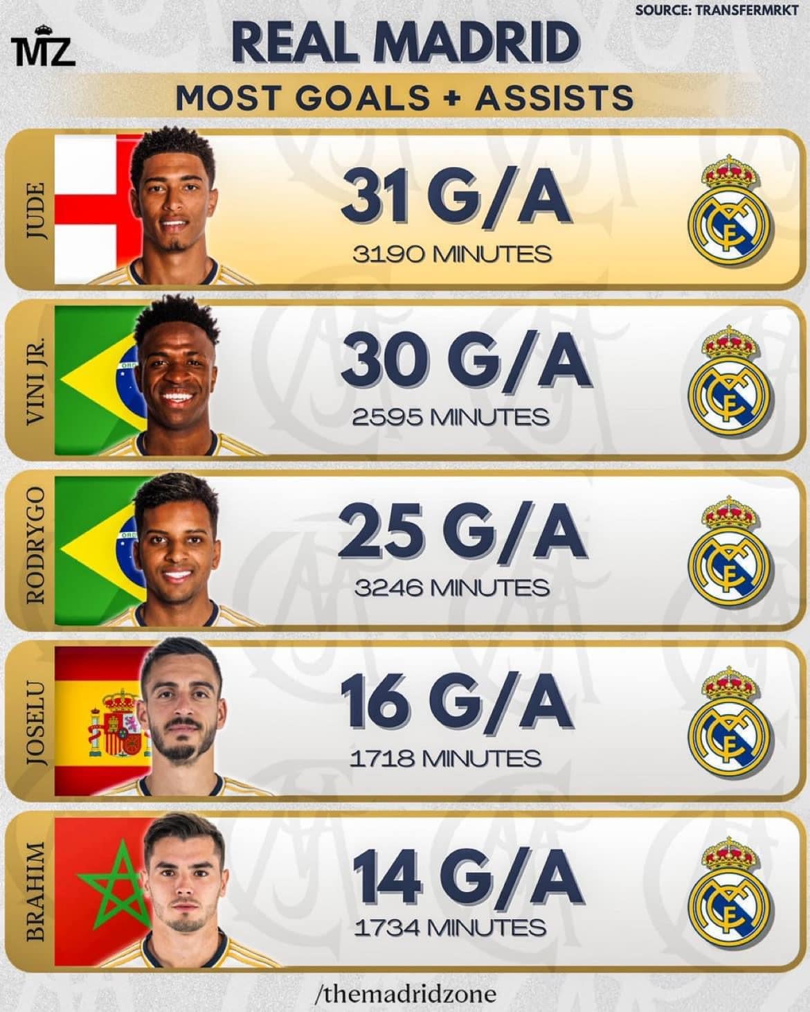 Vinicius only having one less than Bellingham with 600 minutes less it’s impressive, with all the matches he missed with the two injuries
