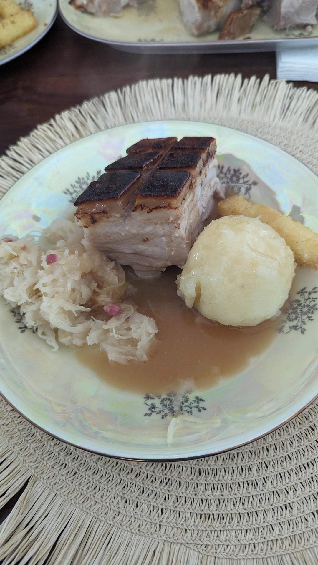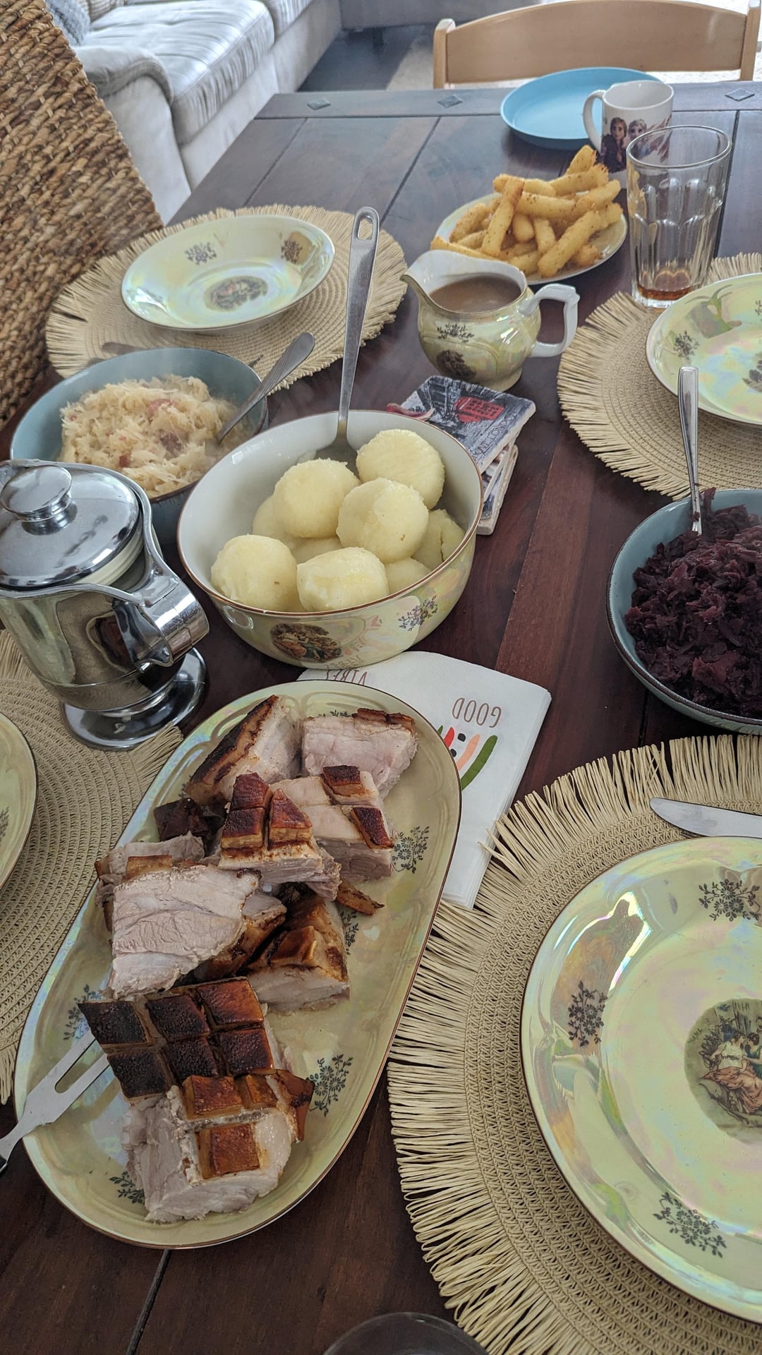 Dazu gab es Rotkohl, Sauerkraut, Klöße und Kloßpommes.