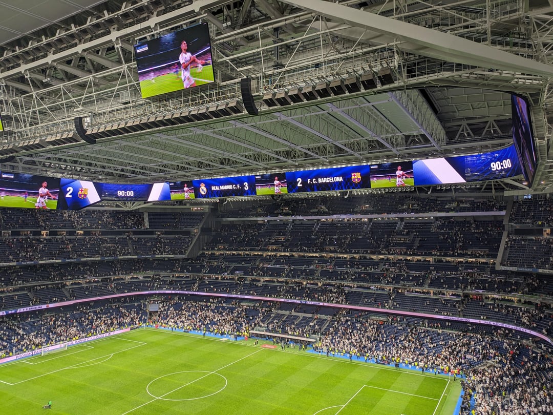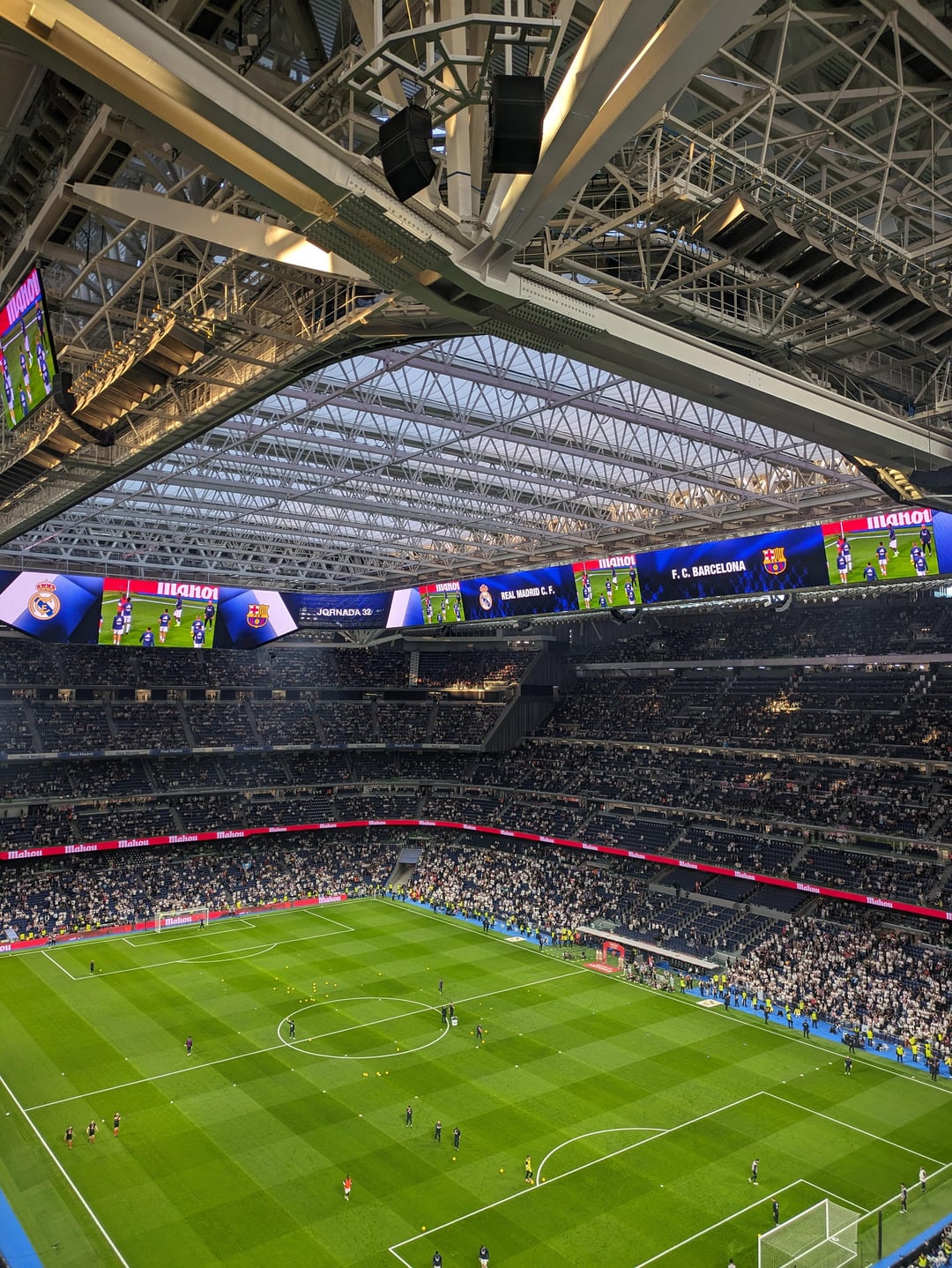 Was yesterday at El Clasico! What an amazing Stadium ..what a Team…this is Santiago Bernabeu …home of Real Madrid! …the New 360 degree scoreboard lit up for first time in a game! Truly awesome!!
