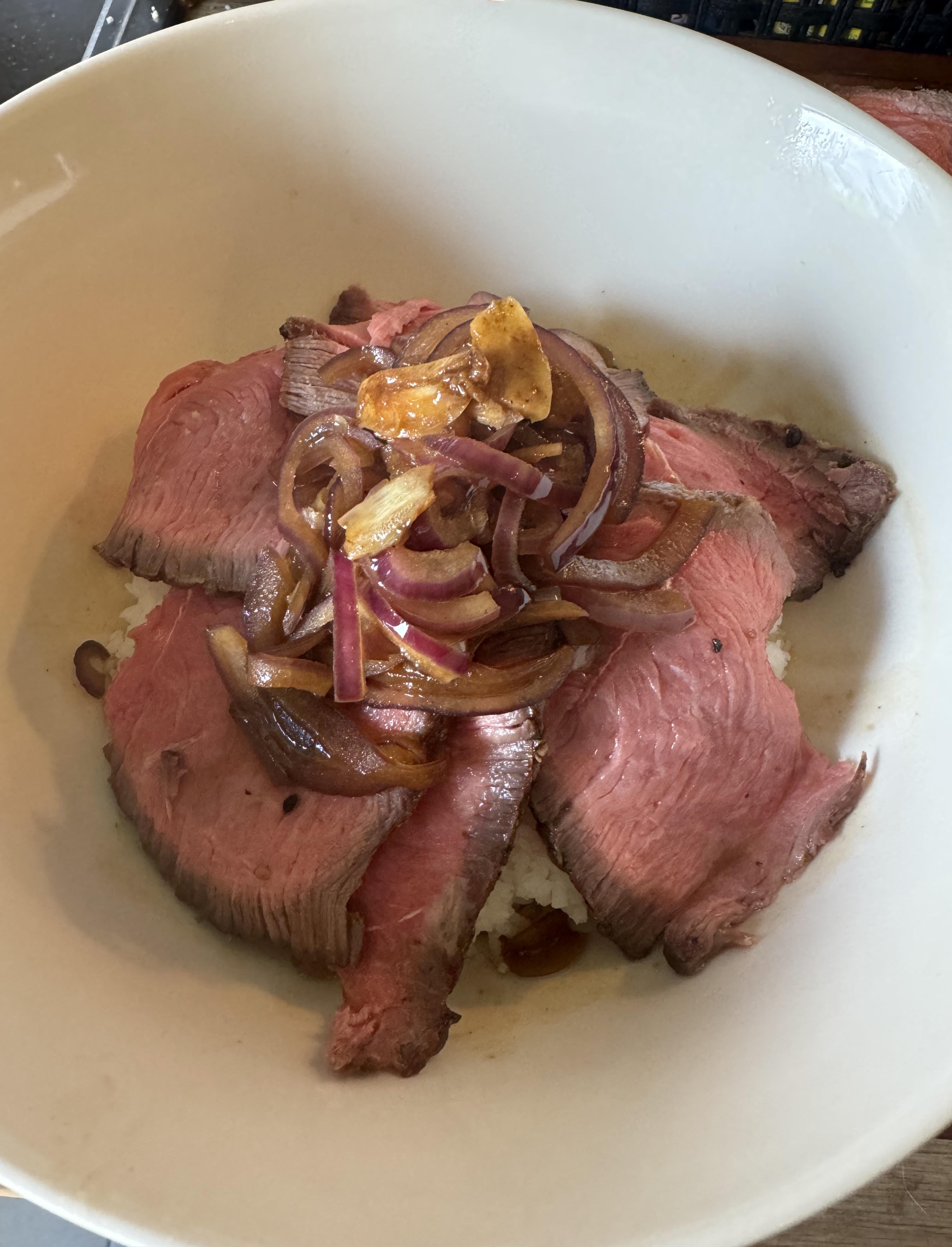 Den Reis in die Schüssel, das Fleisch darauf verteilen und reichlich Zwiebeln und Sauce darüber geben.