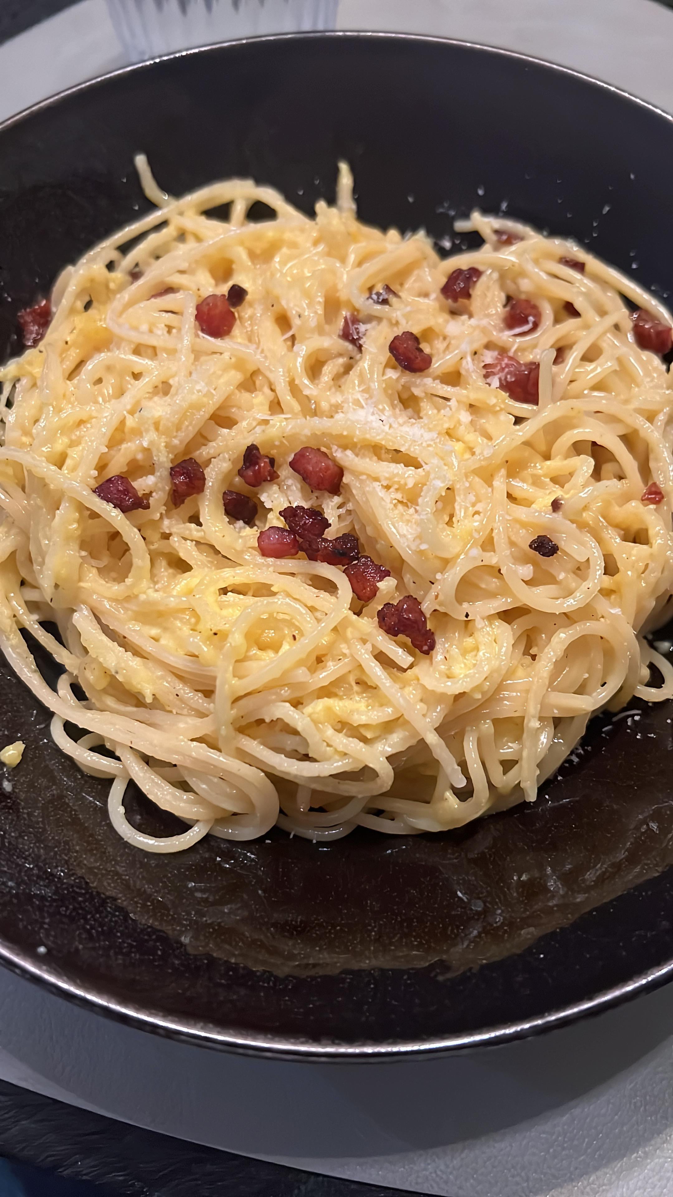 Tipp damit dir das Ei nicht stockt wie auf dem Bild, die Pfanne vor dem abgießen der Pasta vom Herd nehmen damit die Hitze etwas entfliehen kann. Ein besseres Verhältnis sind auf 500 g Nudeln 3-4 Eier und 1-2 Eigelb. Wenn man eine etwas samtigere Soße will darf auch eine kleine Kelle Nudelwasser mit rein.