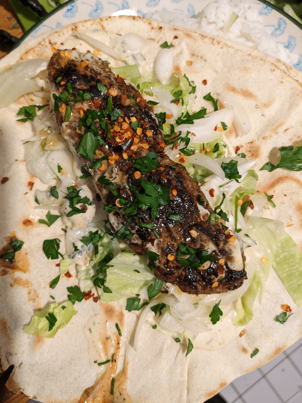 Auf Fladenbrot aus dem türkischen Supermarkt servieren, getoppt mit Salat, Zwiebeln und hausgemachter Joghurt-Knoblauchsoße.