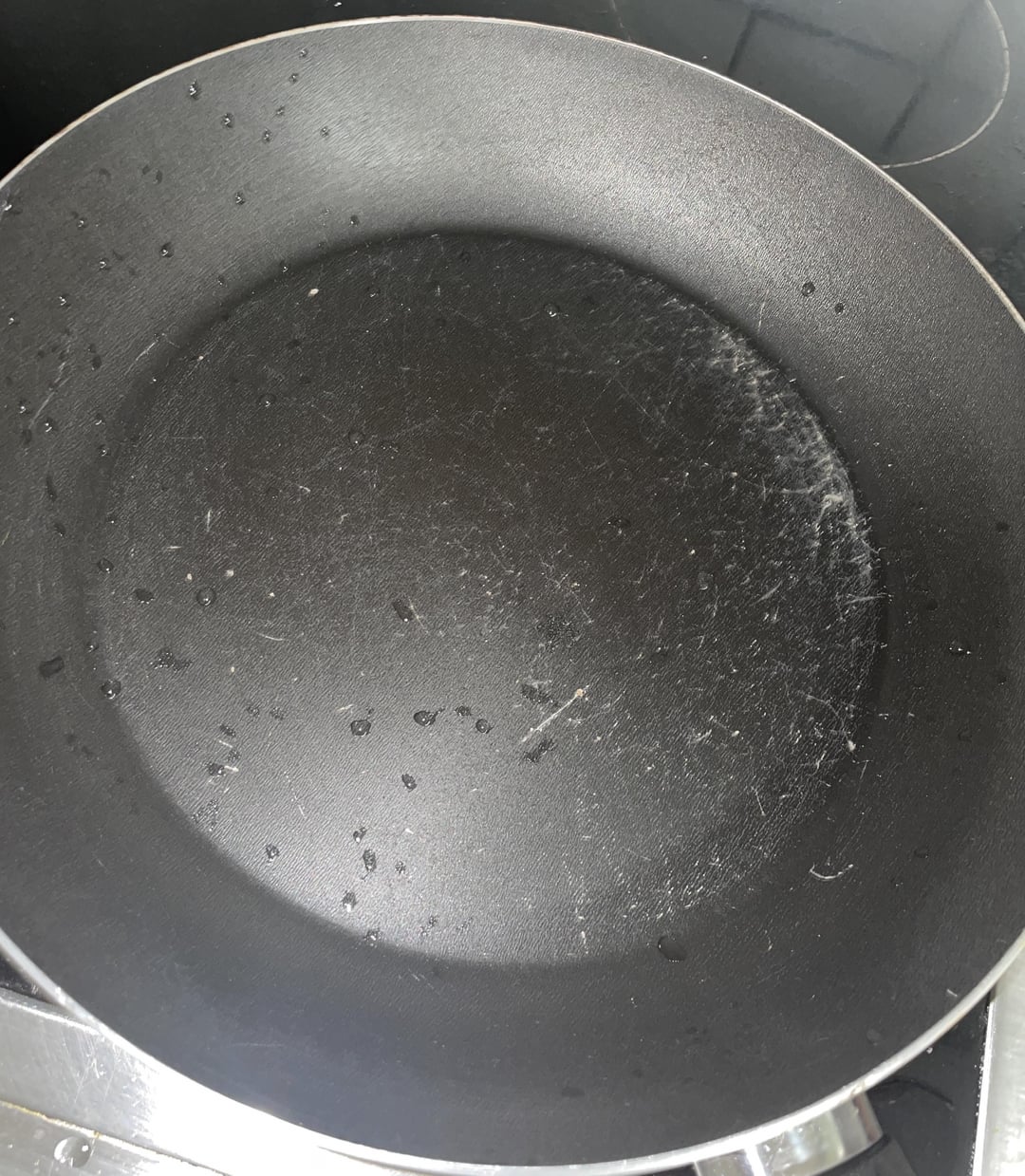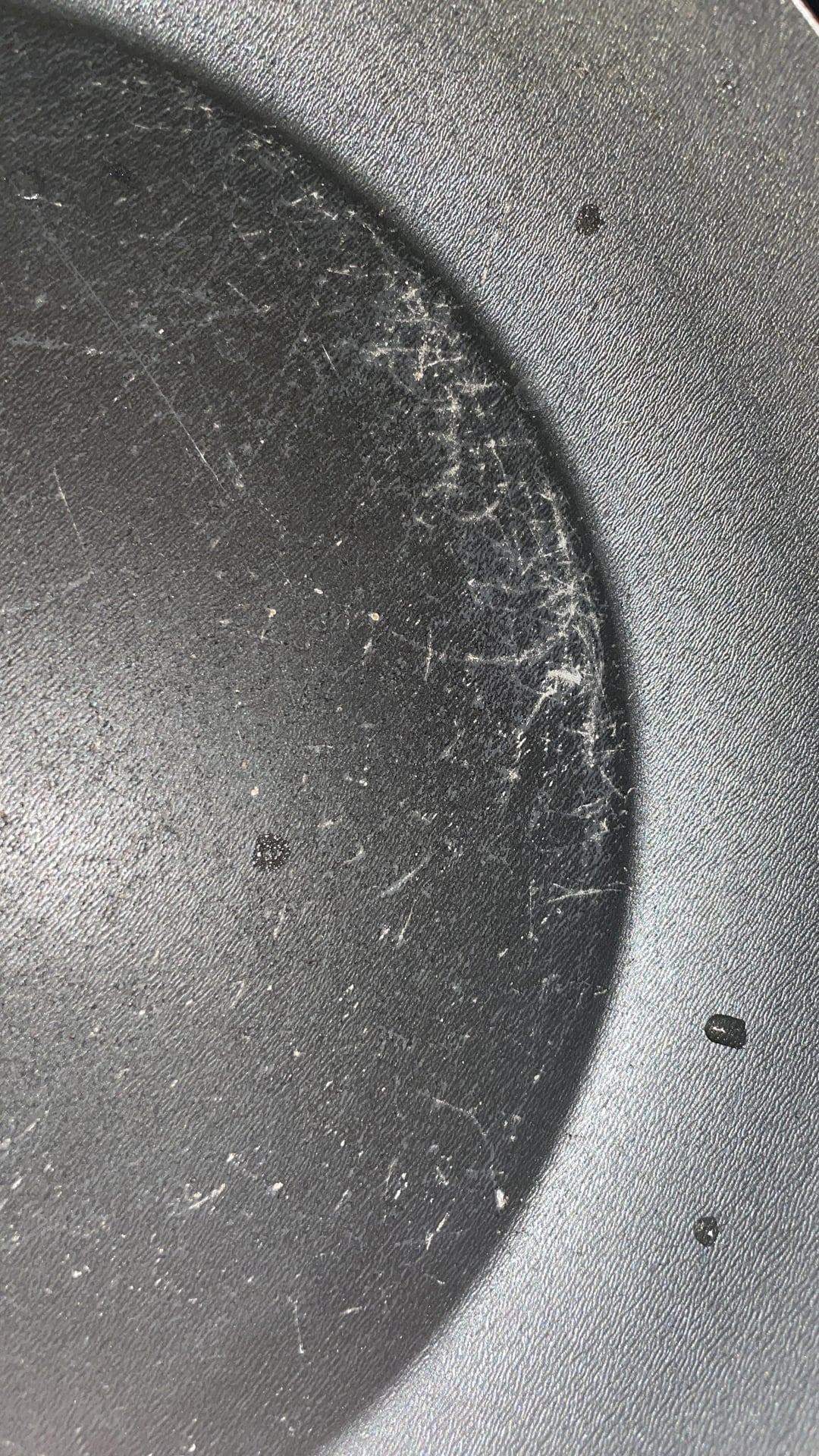 Die Pfanne ist schon ziemlich abgenutzt, daher die Kratzer, s. Bild. Ich habe früher leider oft Metall beim Kochen verwendet, was ich nicht mehr mache.