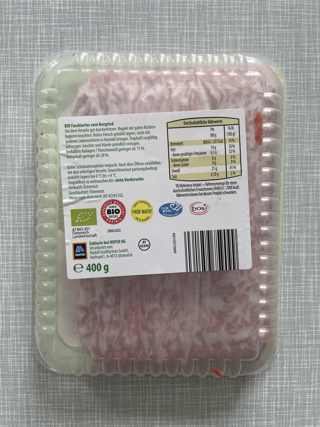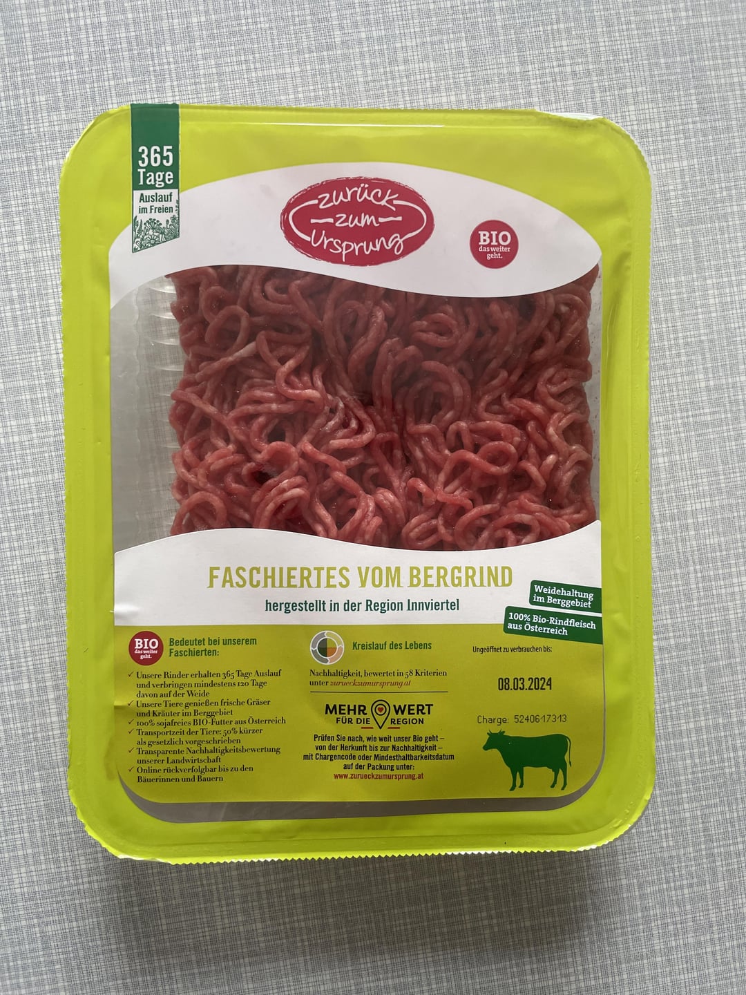 Die Faschiertes-Größen sind sowieso etwas hirnrissiges. Normales Faschiertes? 500g. Ah du willst fettarm? Da haben wir nur eins zur Auswahl und nur 400g. Rinderfaschiertes? Das kommt als 600g.
