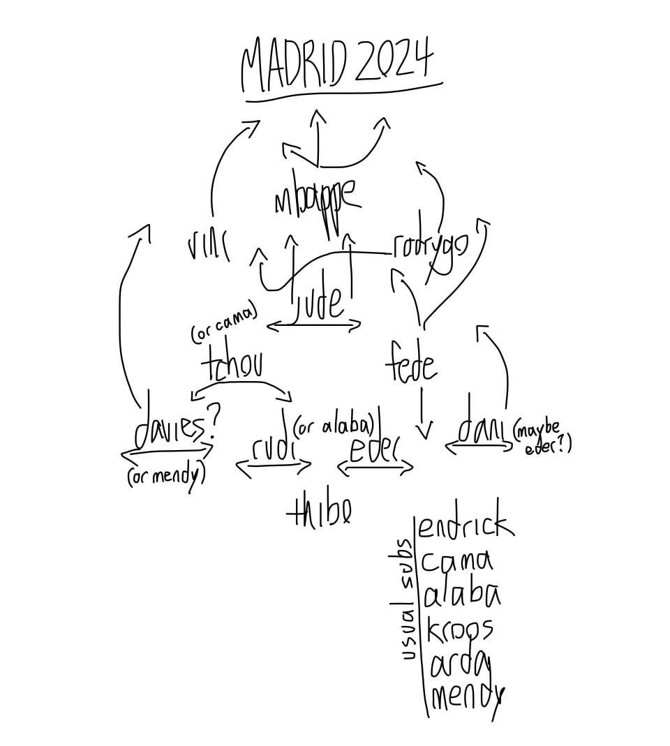 the drawing itself is kinda low effort, sorry, but this is how i envision us lining up and playing tactically next season… i hate not writing modric in here but i just dont see him coming back. i think with how unstoppable rudi has he needs to start, and id give eder the edge over alaba at cb even tho i hate alaba on the bench. but if dani's age becomes an issue, eder's pace might be enough for me to be ok with him at rb. im also not to worried about davies attacking mindset with how good of a defender tchou has turned out to be, if he can build some consistency… but for the wing pace id honestly rather have cama there in situations where davies is playing a lot of the game making forward runs.