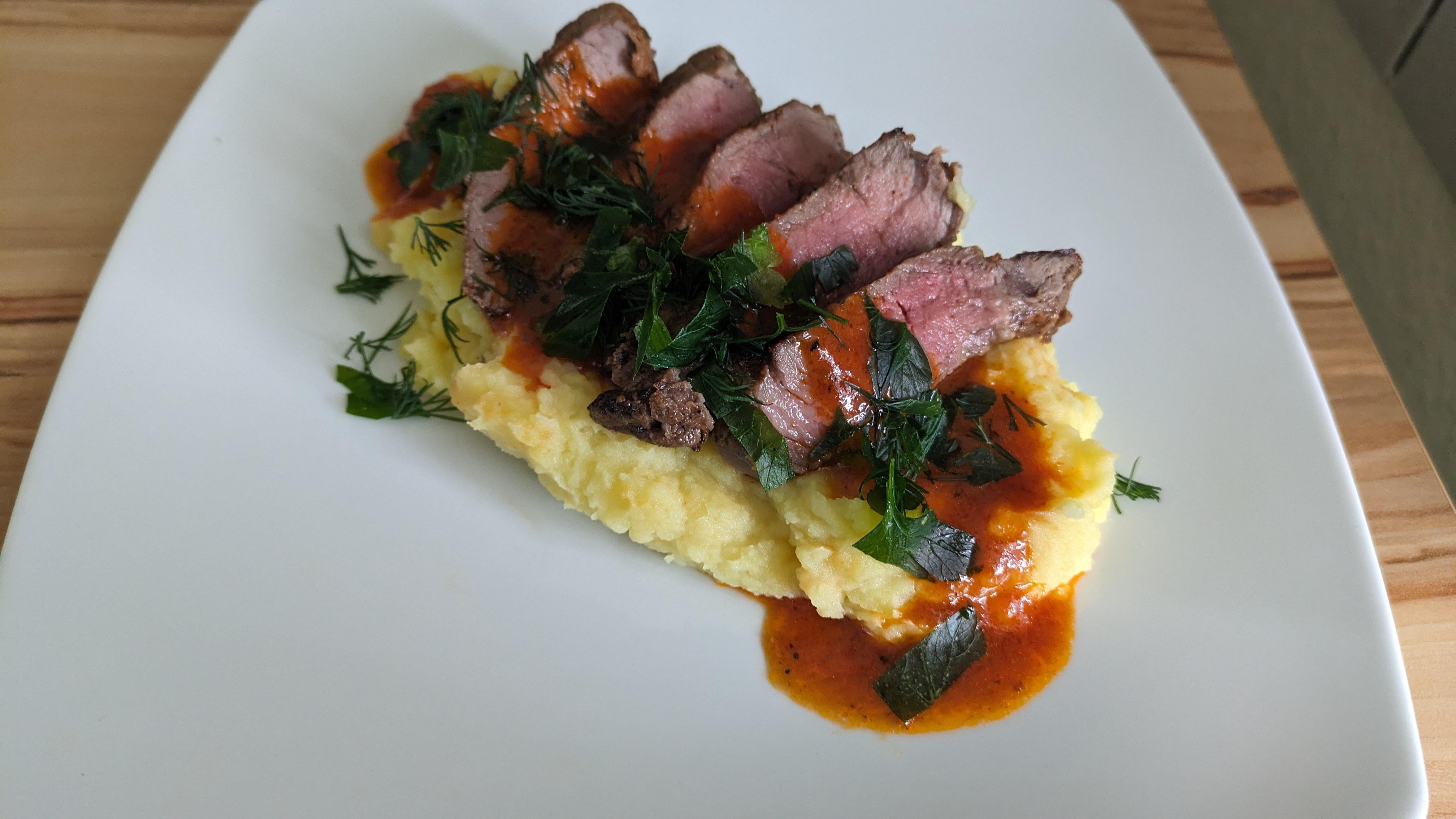 Habe ein Steak gemacht. Habs auf Kartoffelstampf draufgelegt. Aus den wunderbaren Bratrückständen hab ich die Soße gemacht.