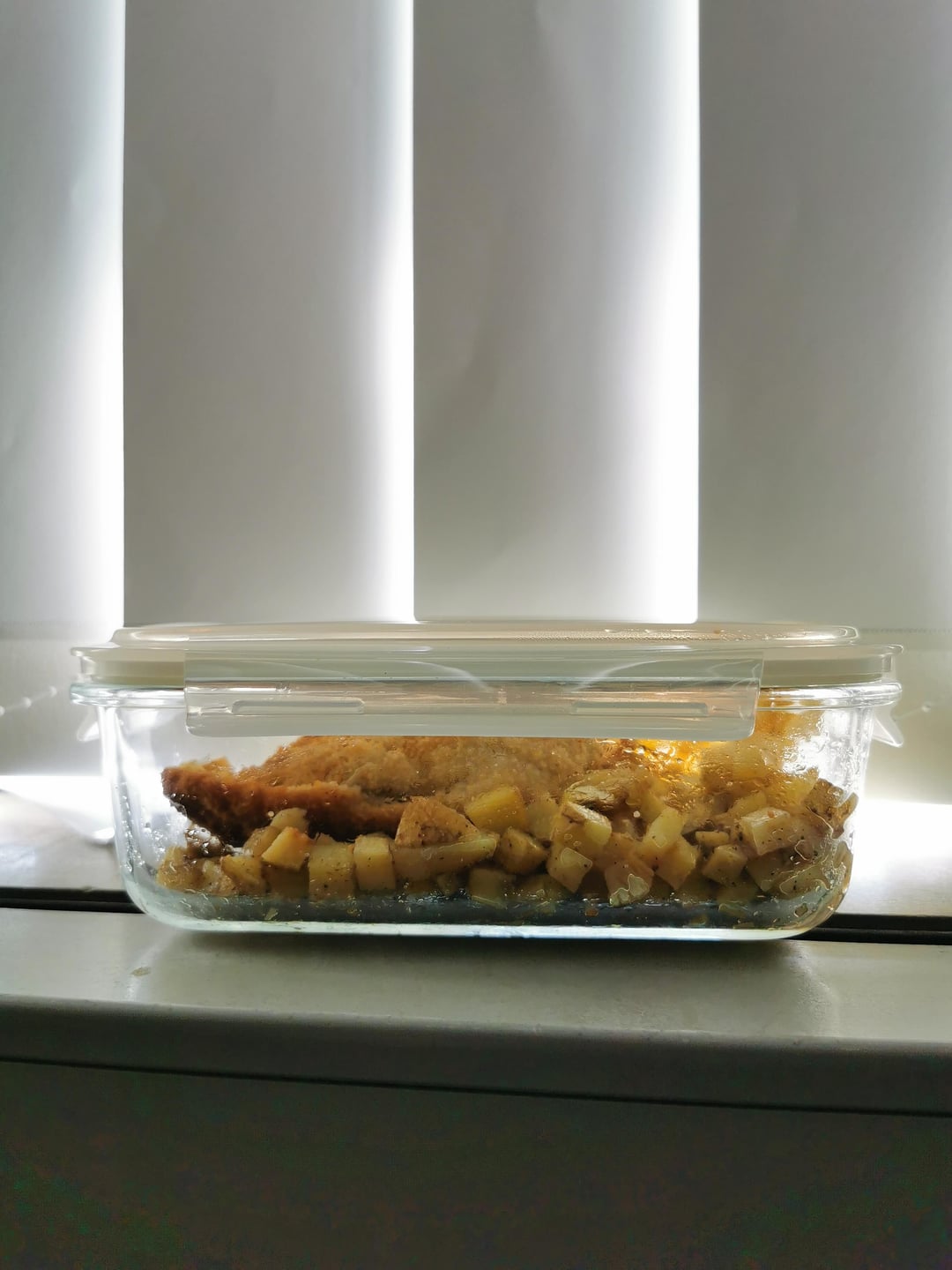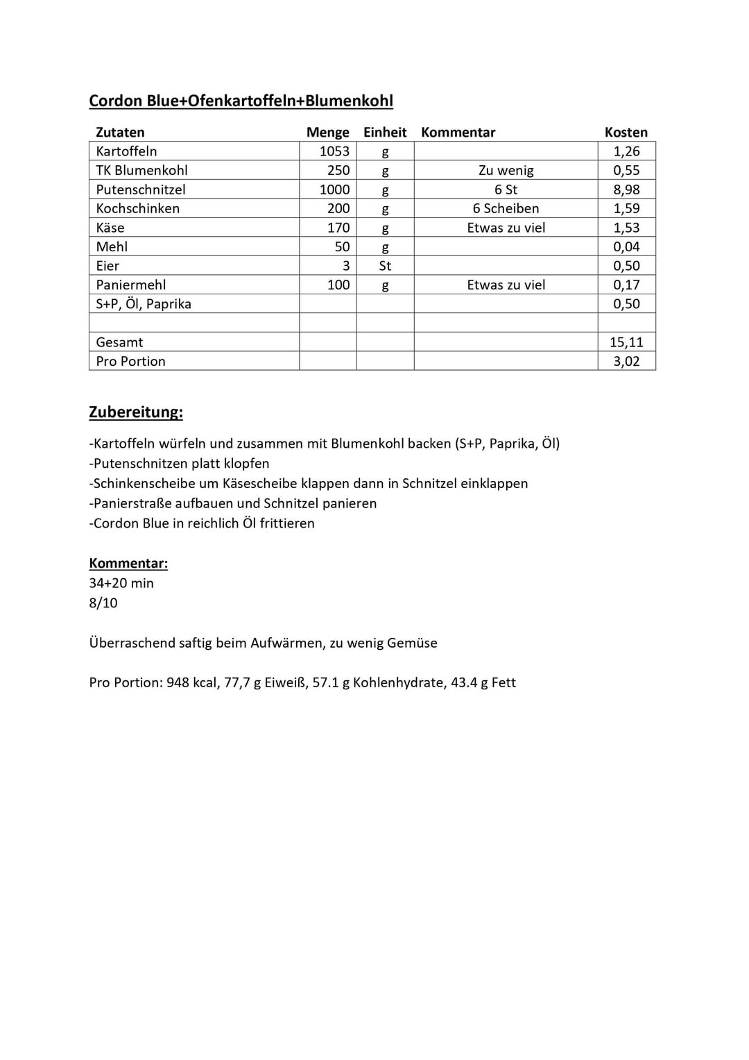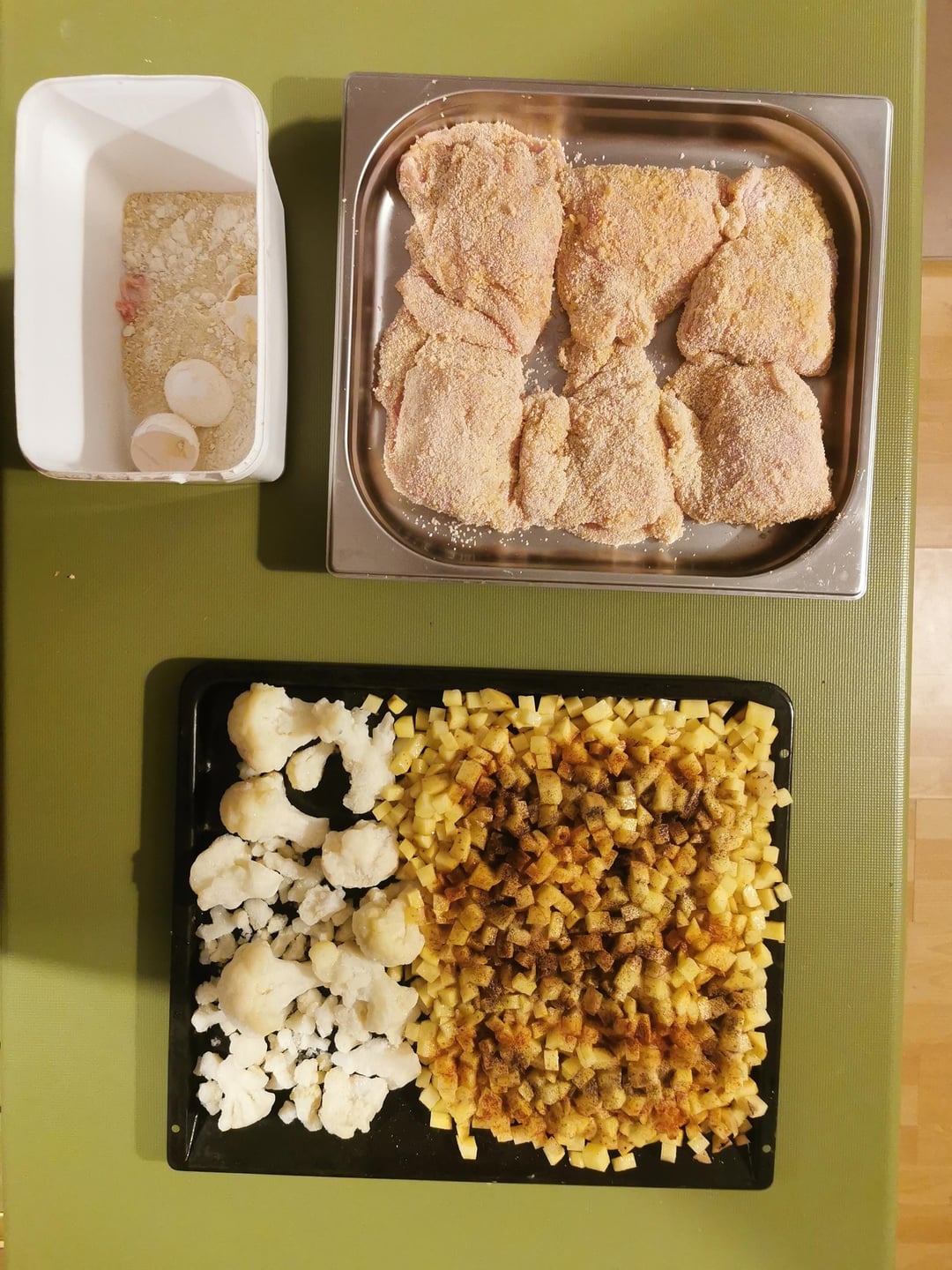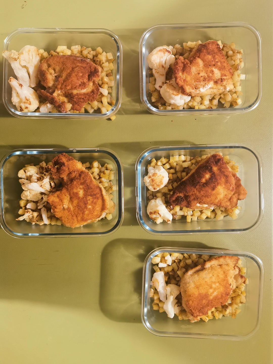 Gericht der Woche hat besser funktioniert als ich erwartet hatte. Panade bleibt natürlich nicht knusprig, aber es ist sehr saftig geblieben die ganze Woche. Blumenkohl sollte mehr sein ich dachte die Tüte wäre noch halb voll gewesen.