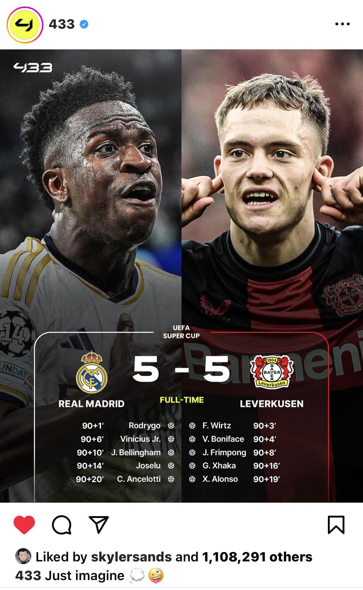 Bayer dominates possession and takes a 1-0 lead into the 90th minute. Mbappรฉ ties it in stoppage time, Madrid wins on penalty kicks.