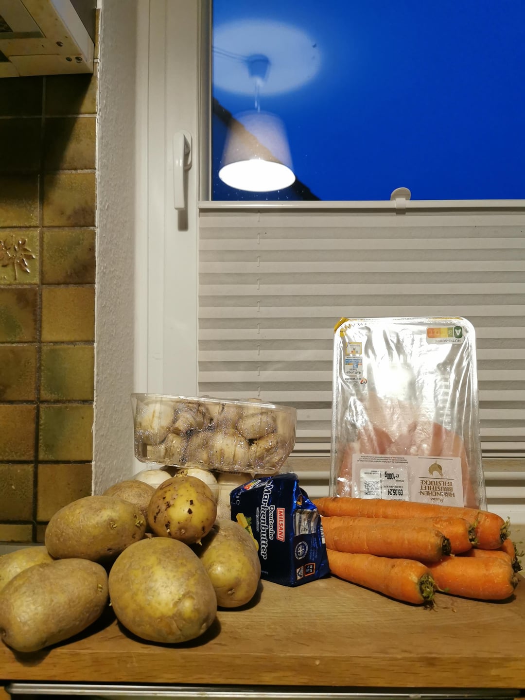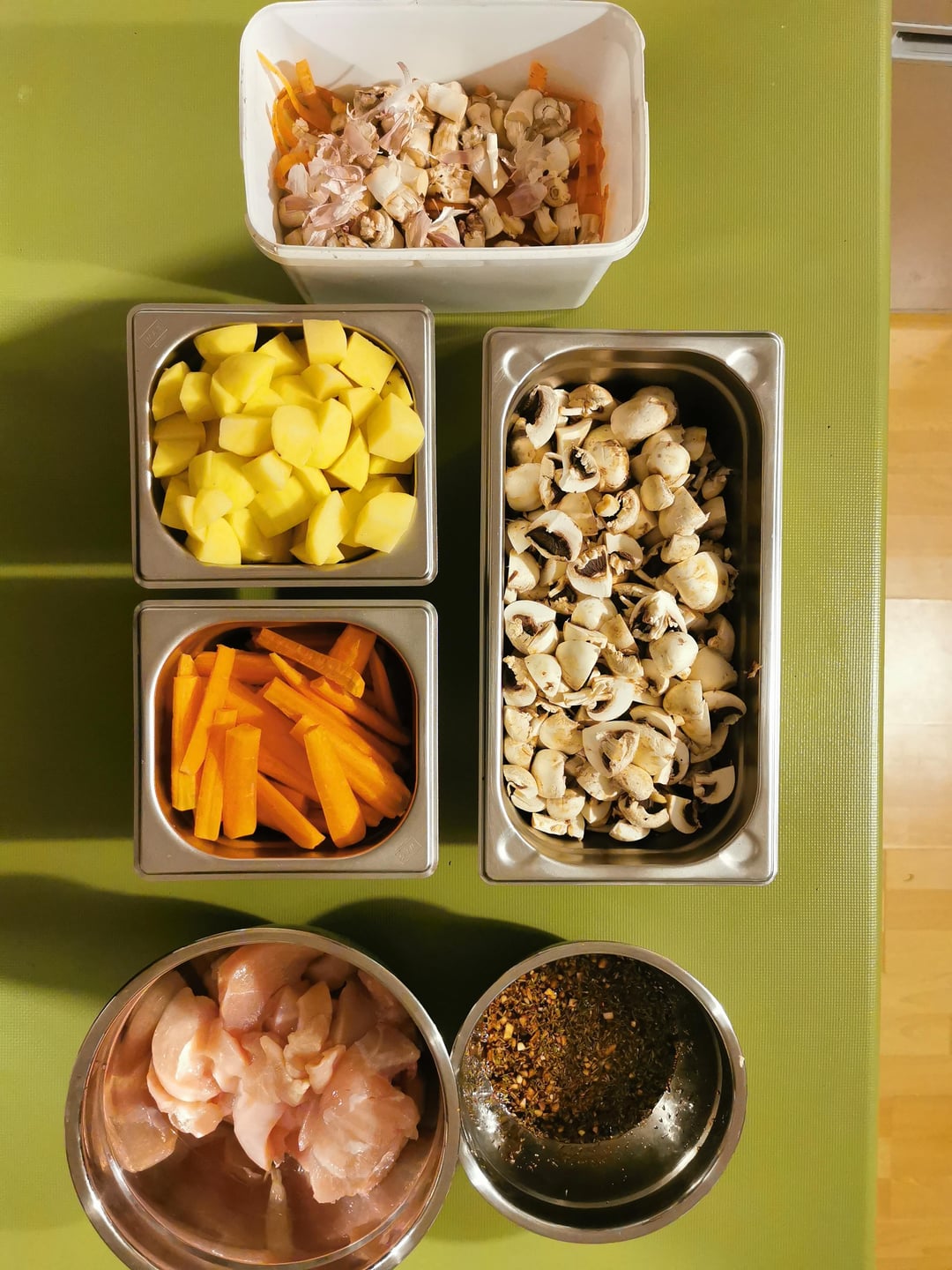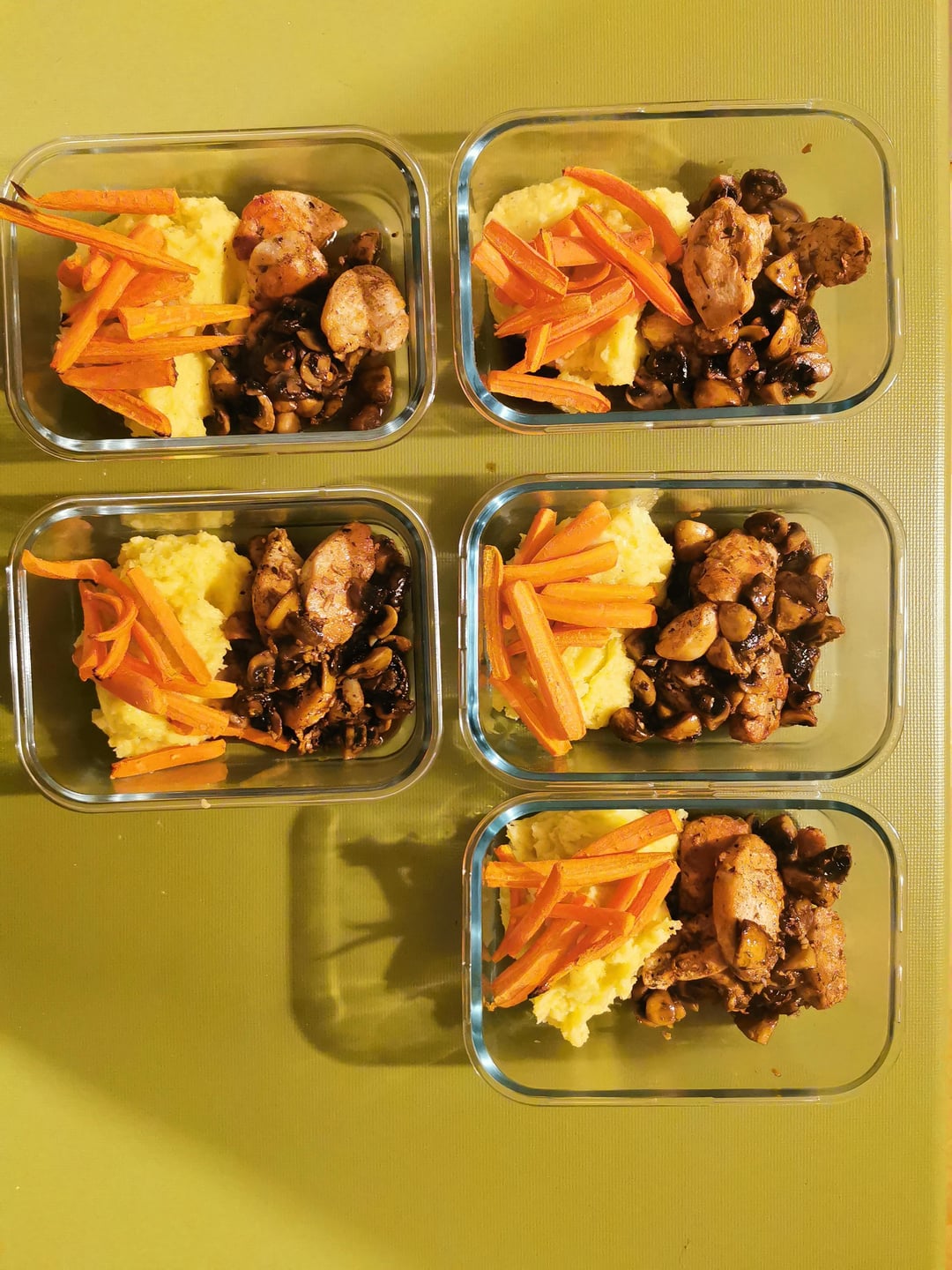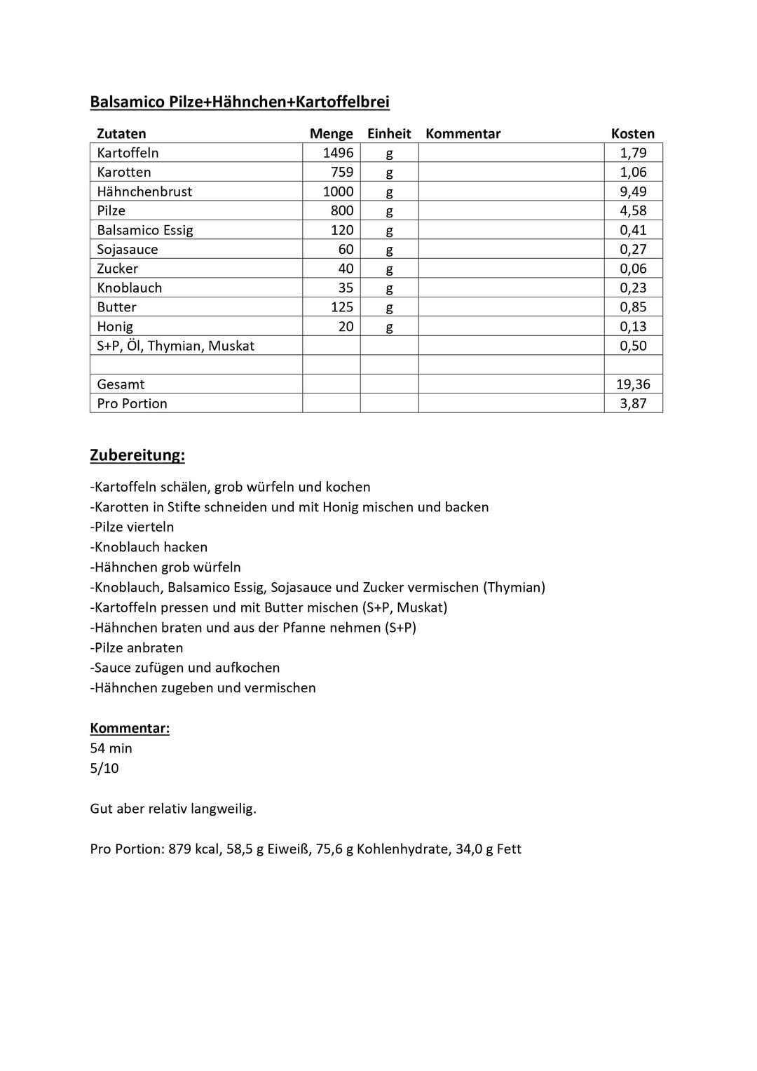 Moin, diese Woche relativ langweilig. Hat zwar gut geschmeckt, aber nichts besonderes. Sind Pilze immer so teuer oder hätte ich einfach nicht ausßerhalb der Saison kaufen sollen? Schönes Wochenende [Instagram](https://www.instagram.com/p/C7EFsu8N0FP/?utm_source=ig_web_copy_link&igsh=MzRlODBiNWFlZA==) -Kartoffeln(1496 g) schälen, grob würfeln und kochen -Karotten(759 g) in Stifte schneiden und mit Honig(20 g) mischen und backen -Pilze(800 g) vierteln -Knoblauch(35 g) hacken -Hähnchen(1000 g) grob würfeln -Knoblauch, Balsamico Essig(120 g), Sojasauce(60 g) und Zucker(40 g) vermischen (Thymian) -Kartoffeln pressen und mit Butter mischen (S+P, Muskat) -Hähnchen braten und aus der Pfanne nehmen (S+P) -Pilze anbraten -Sauce zufügen und aufkochen -Hähnchen zugeben und vermischen