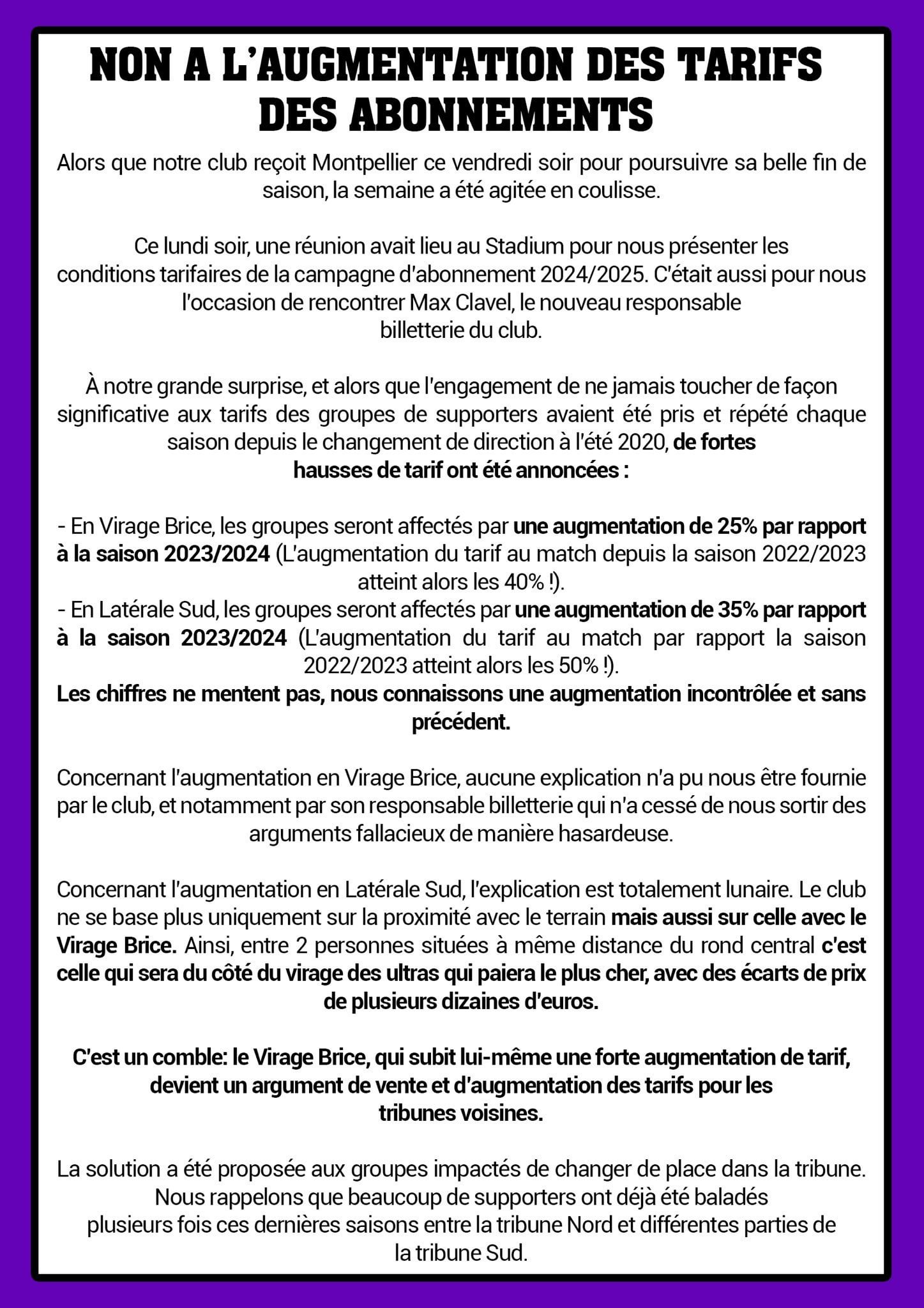Est-ce que vous avez connaissance d’augmentations similaires ailleurs en France ? Pour info l’abonnement était à 180€ l’année dernière en virage bas (avec réduction réabonnement et les 3 matchs de Poule d’Europa League).