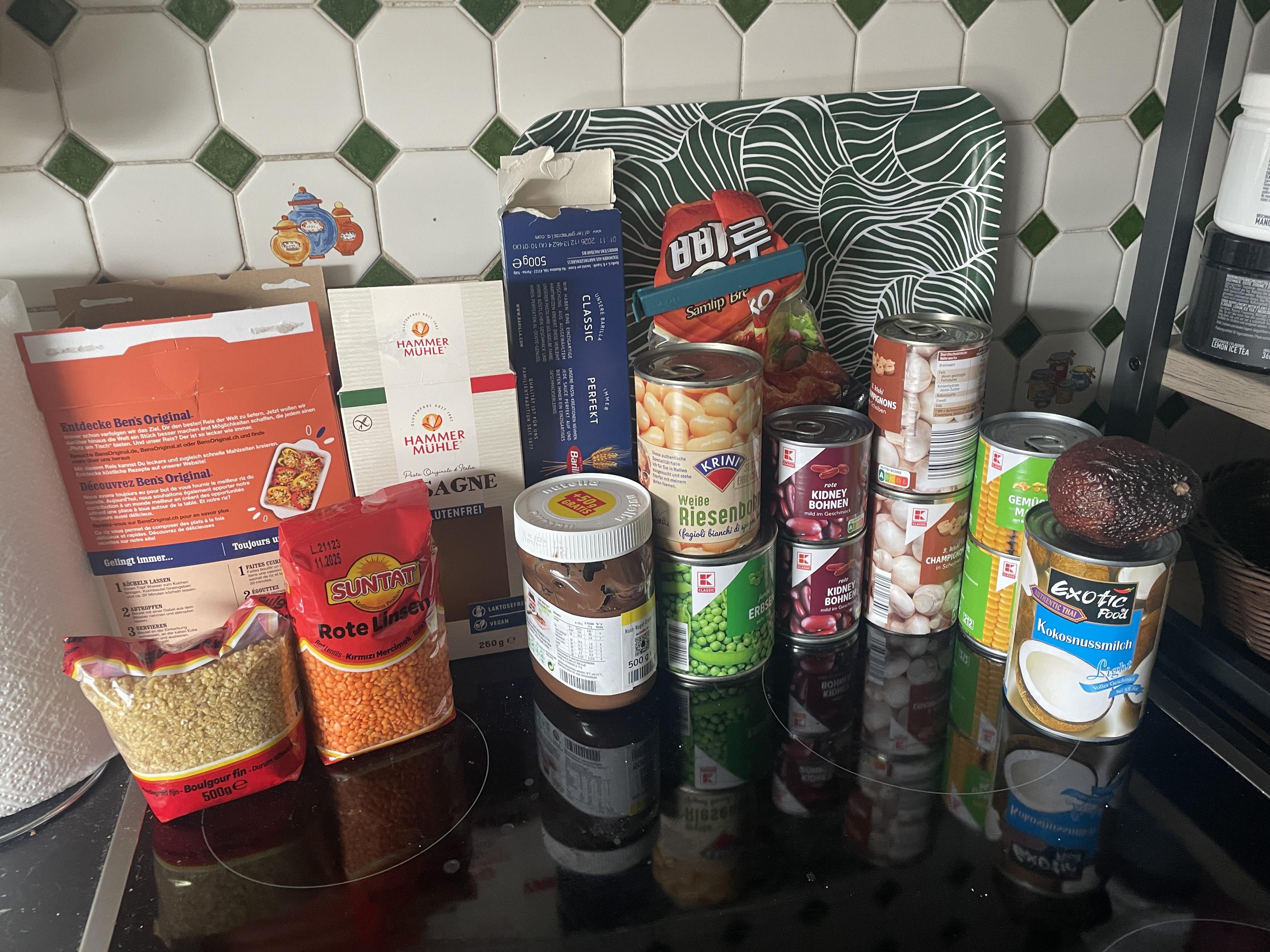 Dann bleiben noch Nutella und die zwei Packungen im Hintergrund von denen ich leider nicht weiß was es ist übrig. Bei Nutella wüsste ich echt nicht wie man die da unterbringt, am ehesten könntest du die noch mit den Spaghetti verarbeiten und machst die Bolo nur in die Lasagne.