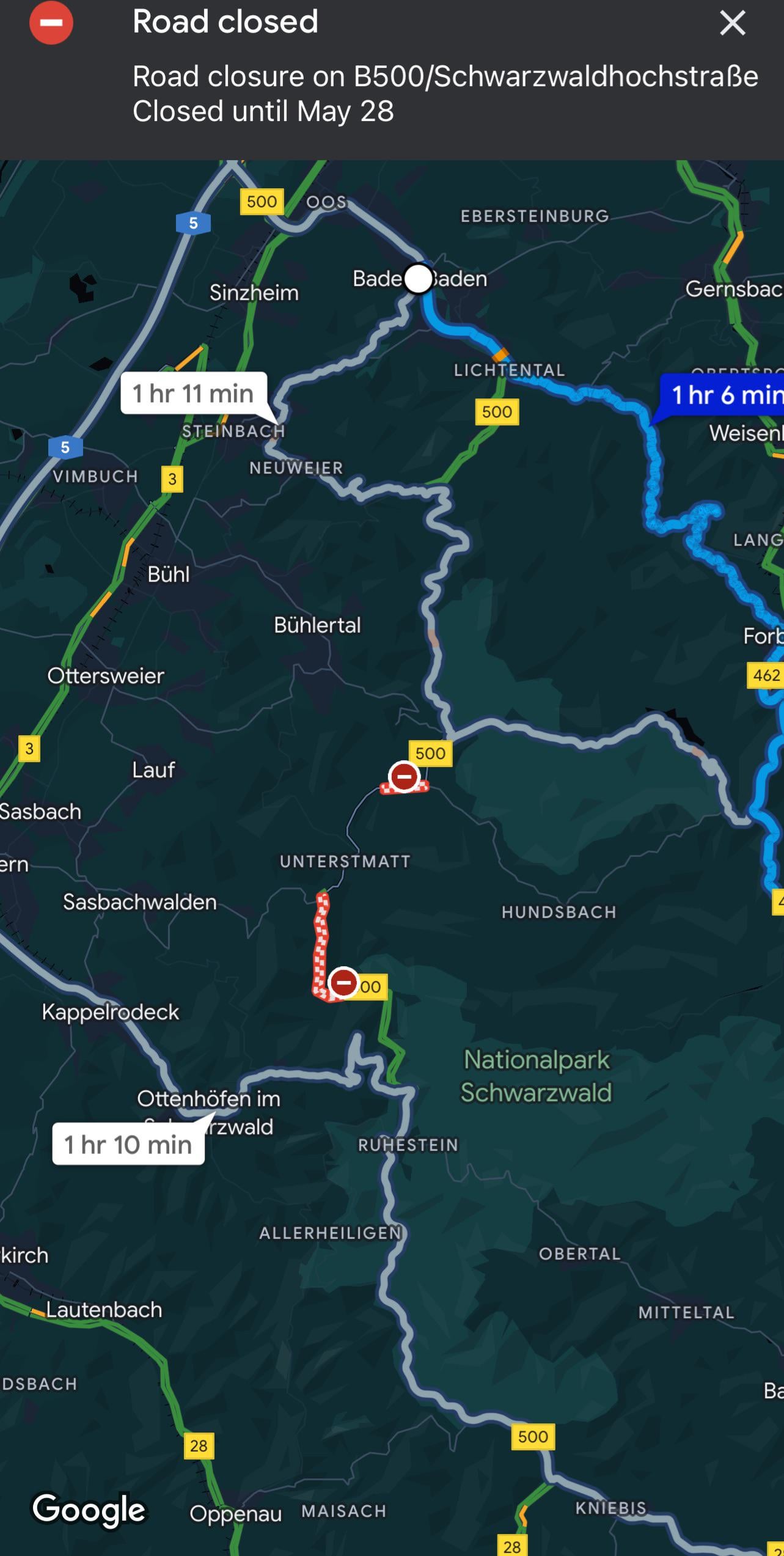 I initially thought of driving the Black Forest High Road on the B500, but noticed some road closures on Google Maps.