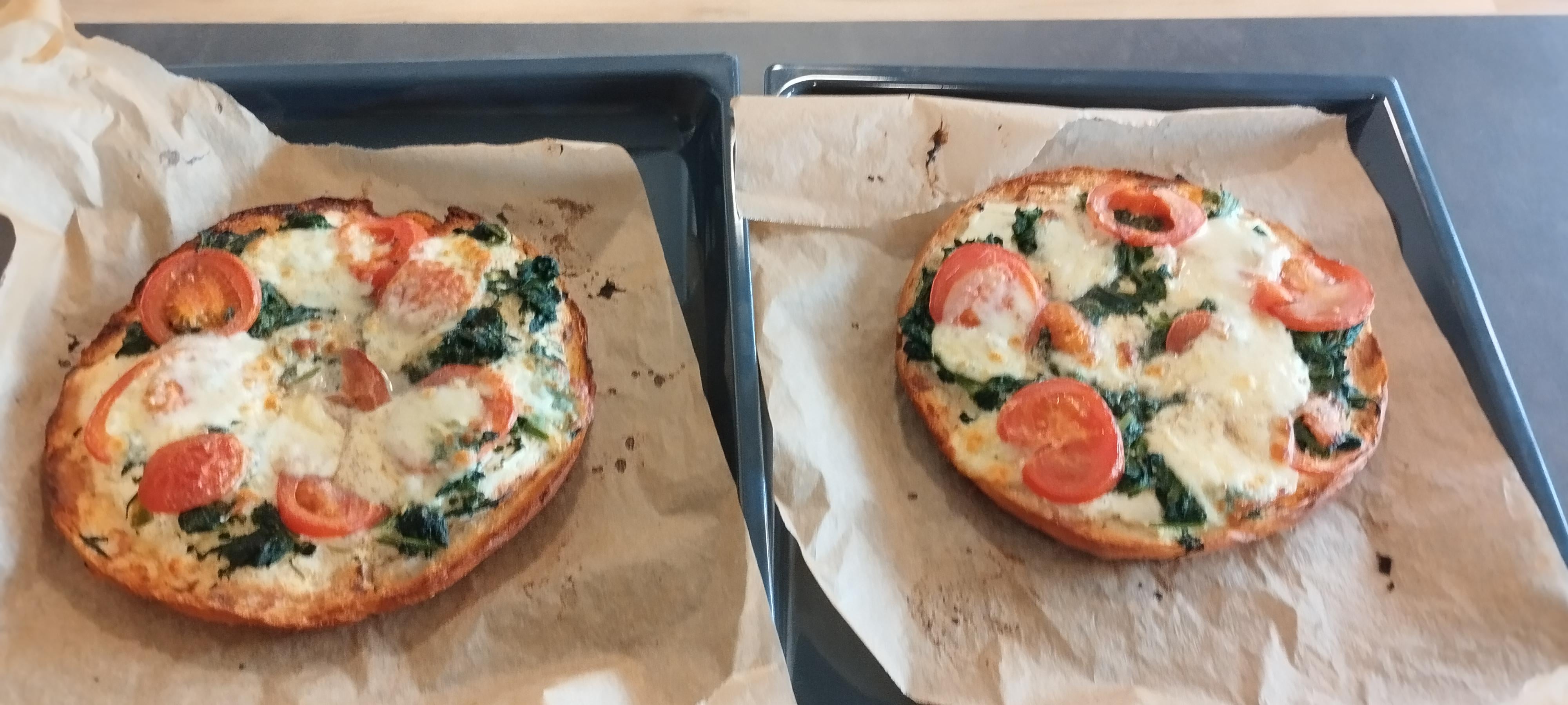 Blattspinat nach Anleitung zubereiten. Den Ofen auf 220 Grad Heißluft vorheizen. Das Fladenbrot längs halbieren und kurz in den Ofen schieben, bis die Schnittflächen fest geworden sind. In der Zwischenzeit Tomaten und Mozzarella in Scheiben schneiden. Fladenbrot wieder entnehmen und die Hälften mit dem Frischkäse bestreichen. Erst mit dem Blattspinat belegen, anschließend die Tomatenscheiben und danach den Mozzarella. Mit Salz und Pfeffer würzen und ca. 20-30 Minuten bei 220 Grad backen, bis das Brot schön knusprig ist.