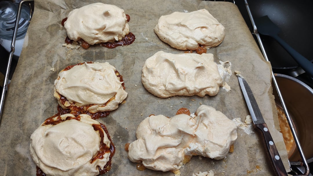 Ich trockne erst alle Baisers im Ofen, streiche die Füllung auf die abgekühlten Stücke und lege DANN oben einen Baiser auf.