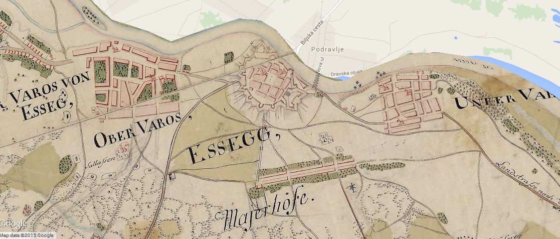 Ovo je karta Tvrđe. Donji i gornji grad se ne vide, a to je ono što se kroz povijest sve zajedno smatralo kao Osijek Evo jedna karta gdje se vidi cijeli Osijek: https://www.arhitekti-hka.hr/files/images/novosti/2015/os.jpg