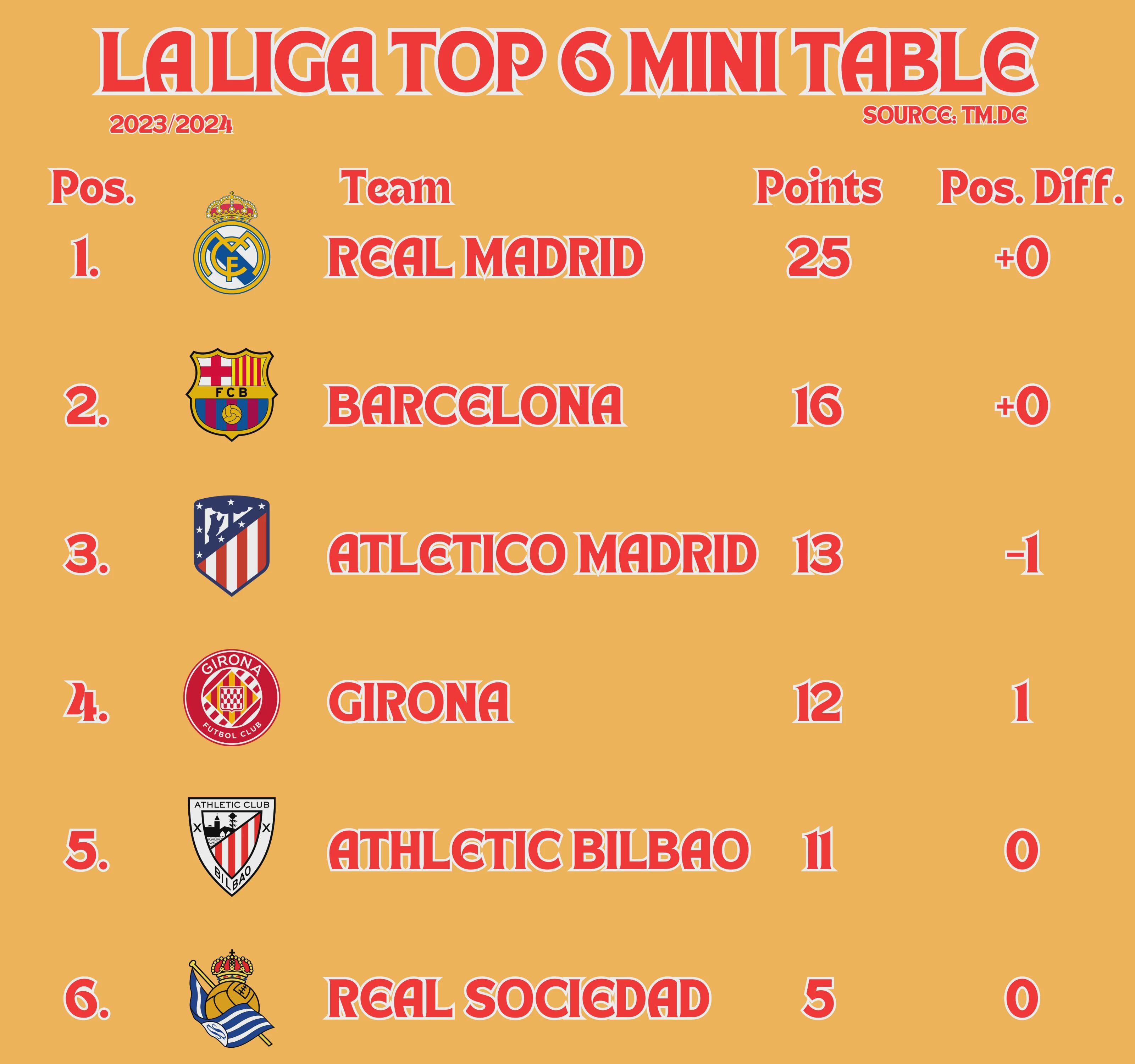 Mini-table of the La Liga top 6 this season (credit /u/zestyviper) by nunixnunix04 Tags:FootballHala MadridLa LigaReal MadridReal Madrid CFSoccerspainSpanish Soccer 2 comments We won every game against the top 6 except: * 3-1 Loss vs Atletico (A) * 1-1 Draw vs Atletico (H) People aren’t talking about the fact that we only had one loss enough (also a bit annoying that we were that close lol). Massive credit to Carlo for doing it despite the injuries / no 9, because that is honestly insane. Leave a ReplyYou must be logged in to post a comment.
